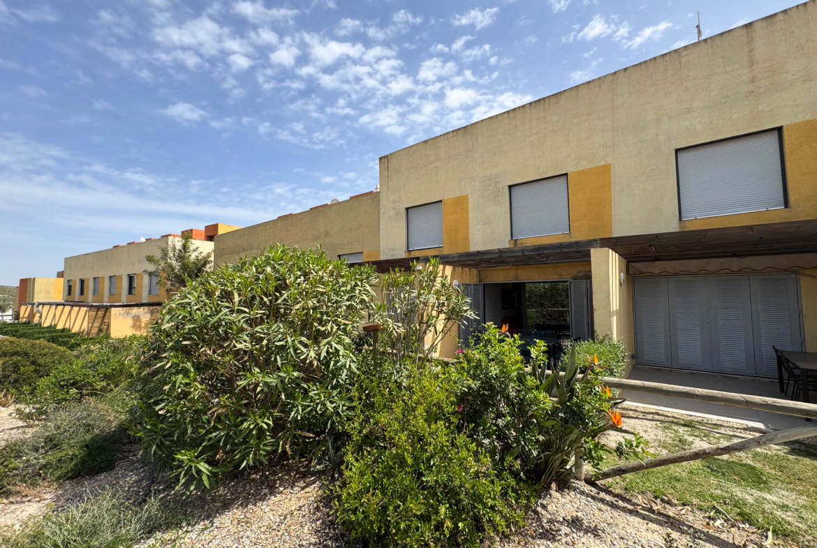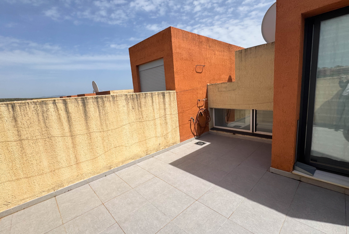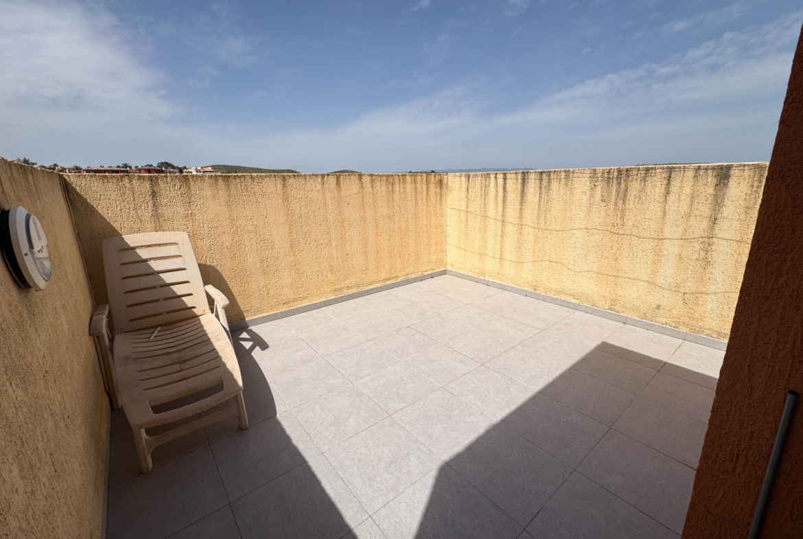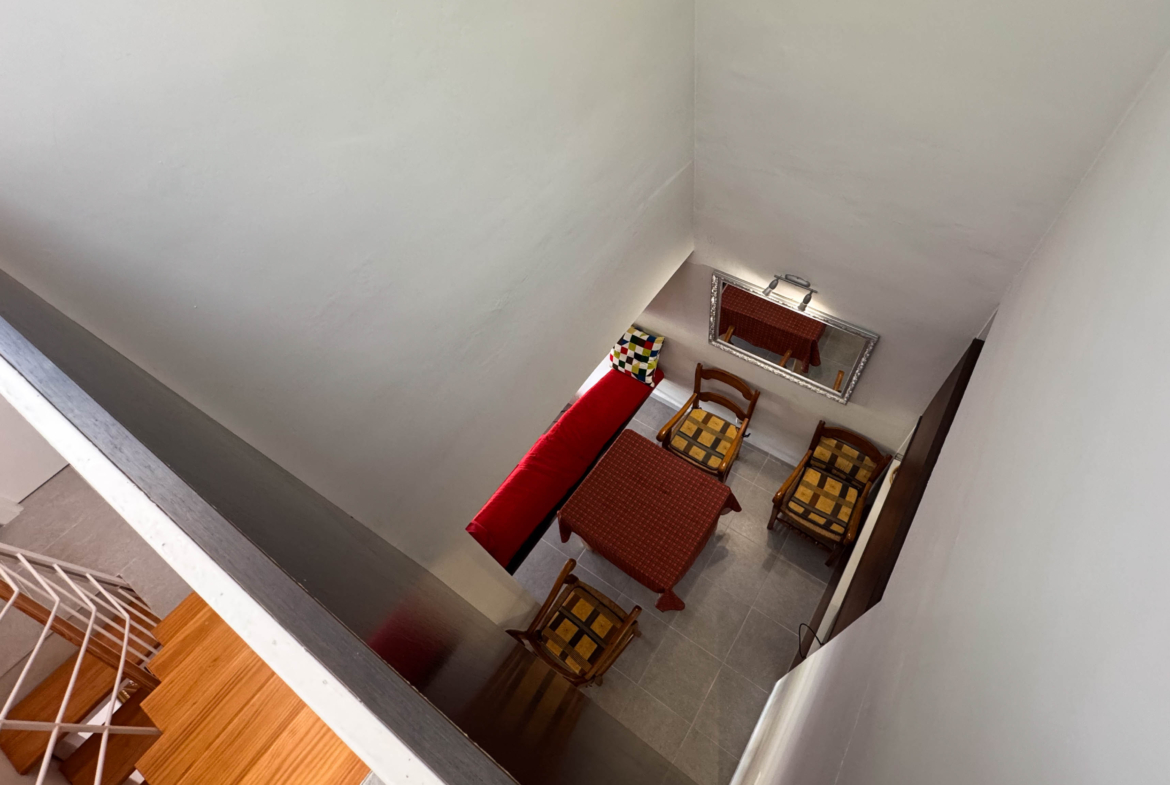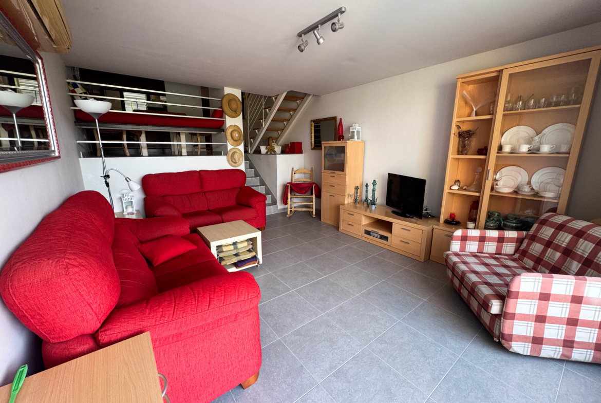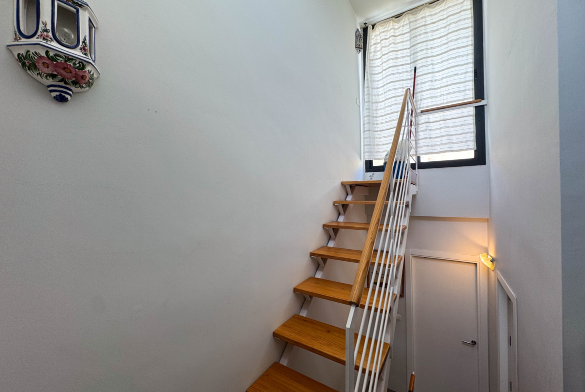 The second floor houses the two bedrooms and a bathroom with a walk-in shower, offering privacy and comfort. Furthermore, the 14-square-meter solarium at the top is the perfect spot for sunbathing or enjoying the starry nights. The community-maintained garden adds a touch of greenery and freshness to the surroundings.