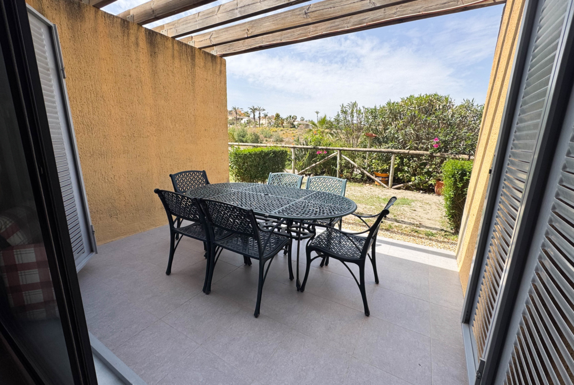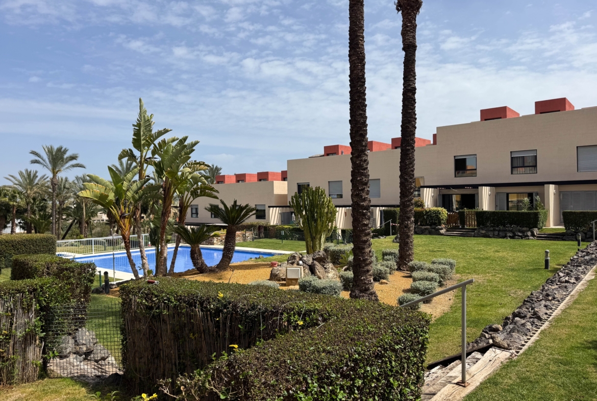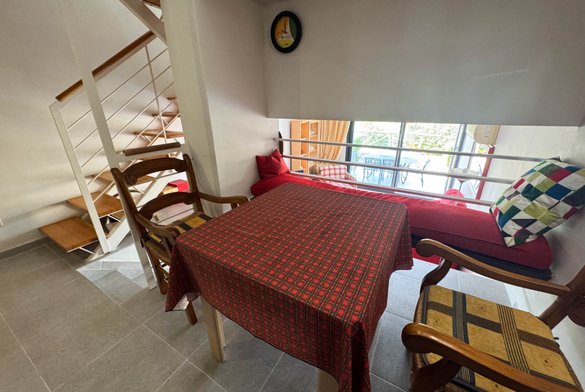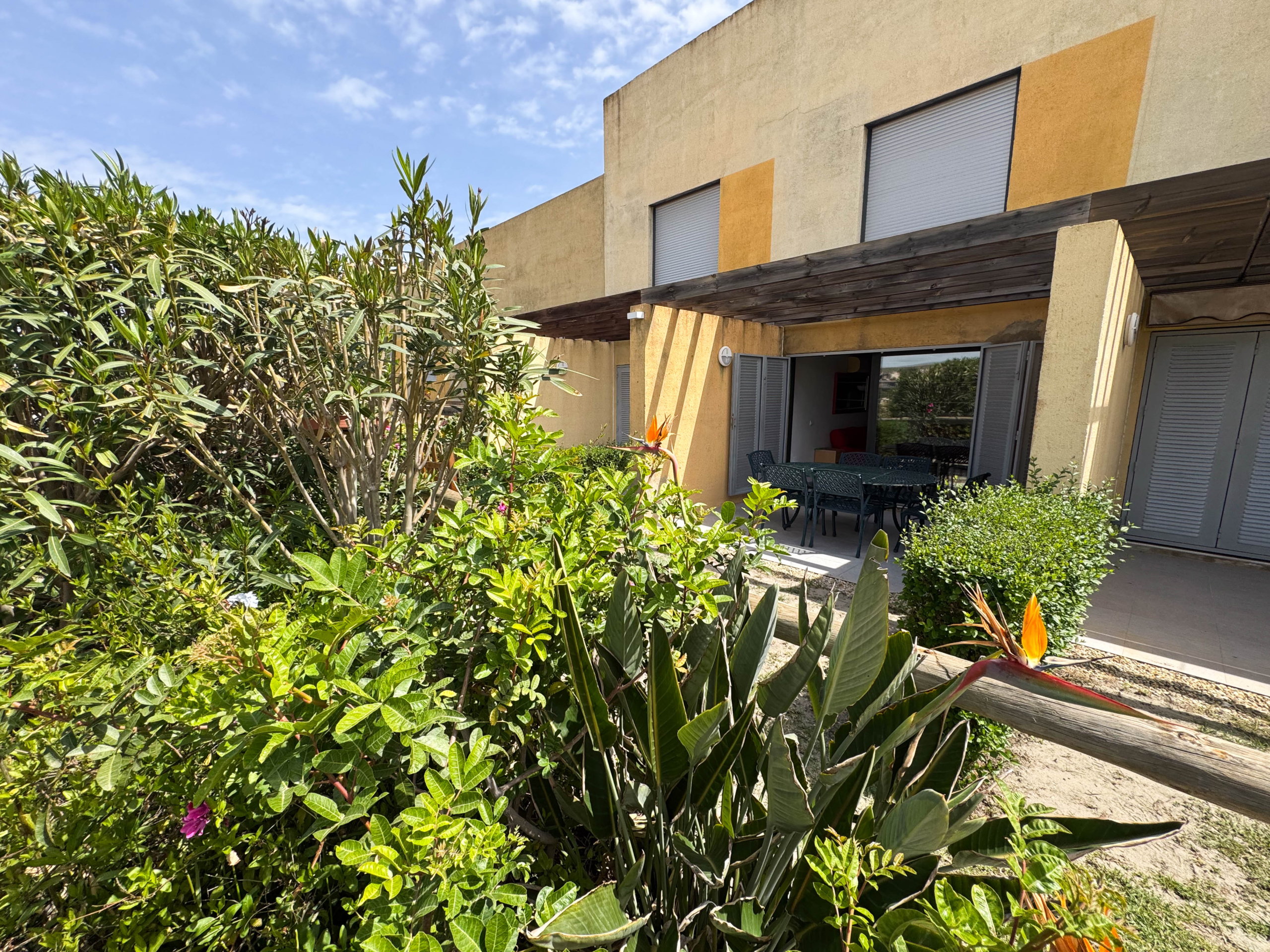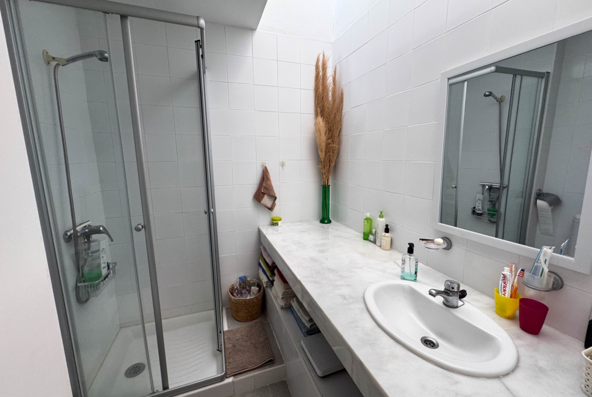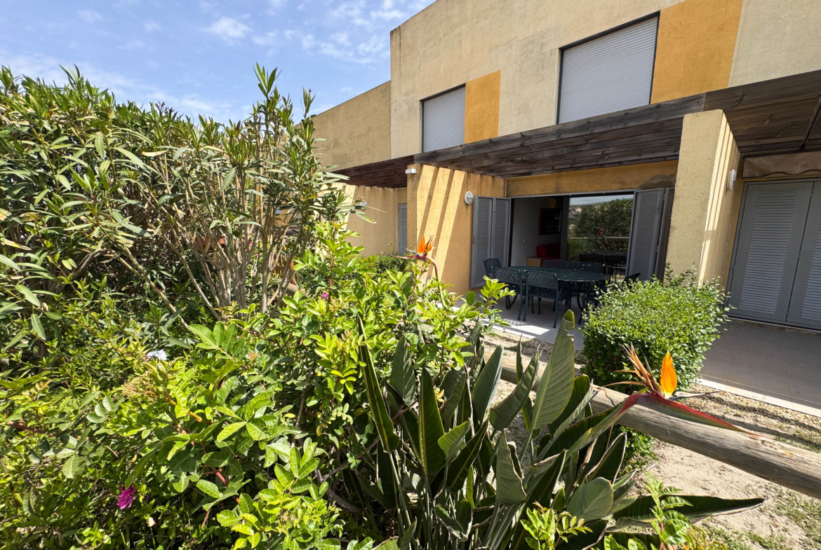 The second floor houses the two bedrooms and a bathroom with a walk-in shower, offering privacy and comfort. Furthermore, the 14-square-meter solarium at the top is the perfect spot for sunbathing or enjoying the starry nights. The community-maintained garden adds a touch of greenery and freshness to the surroundings.