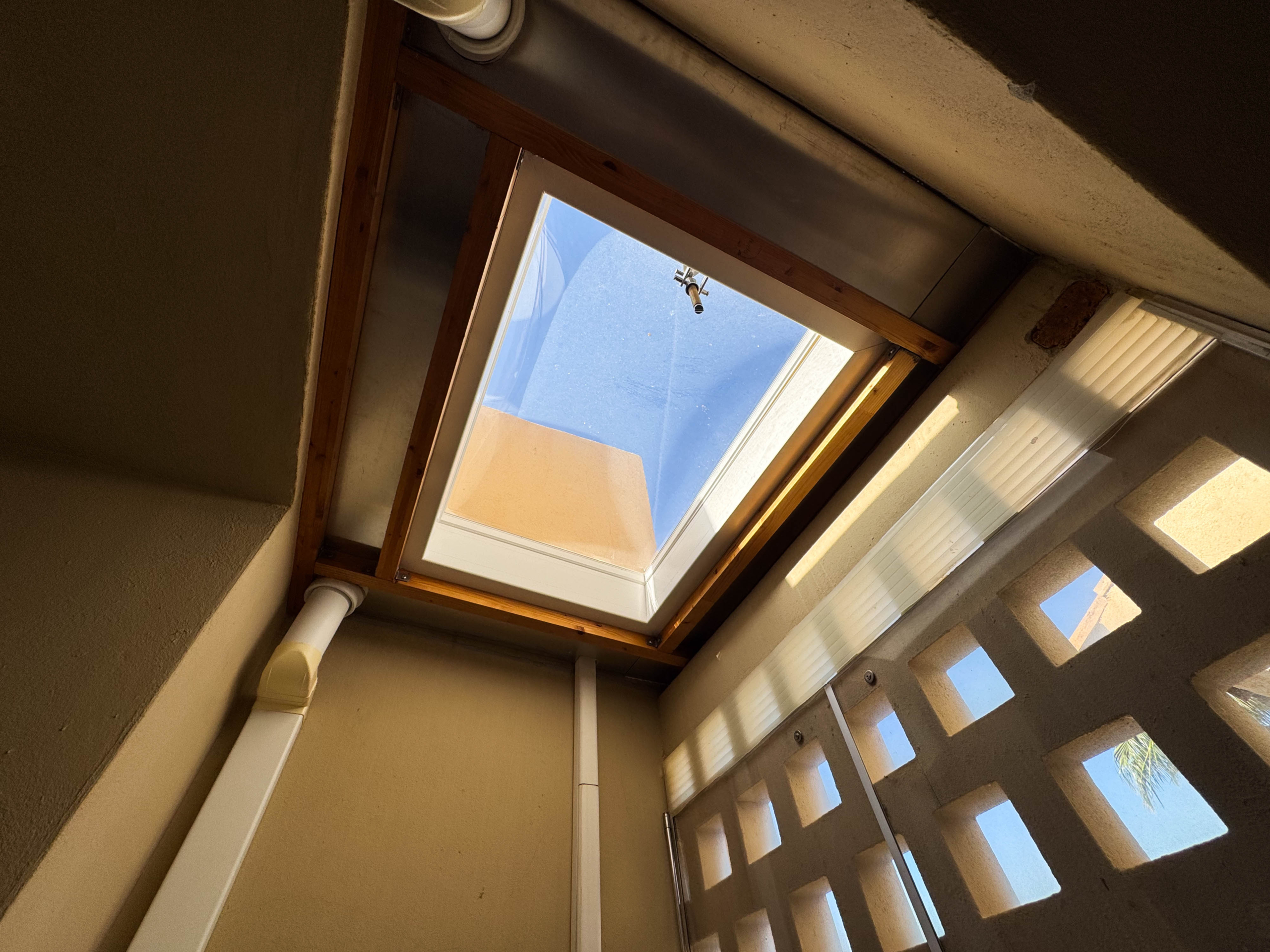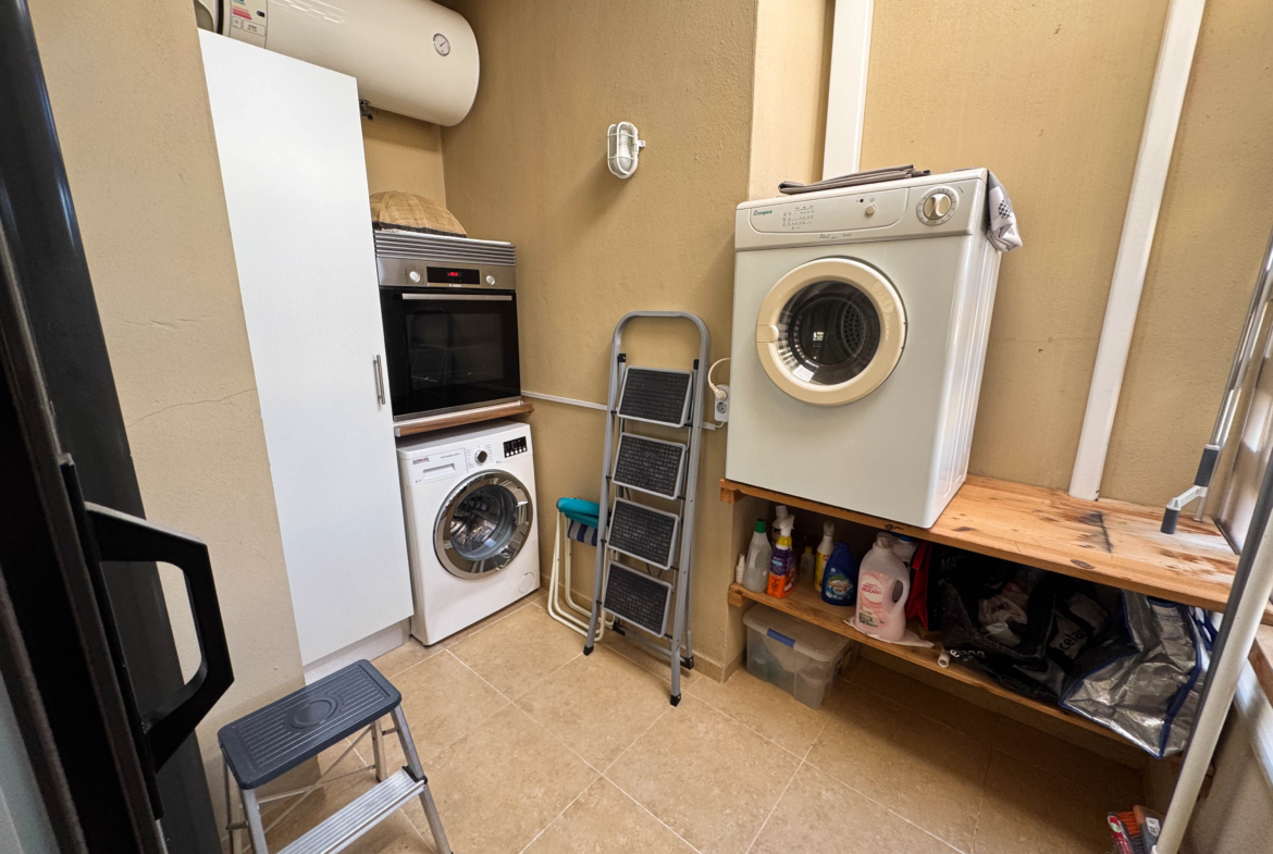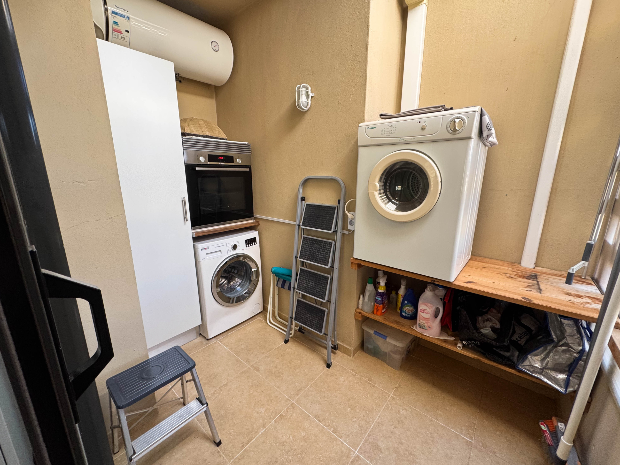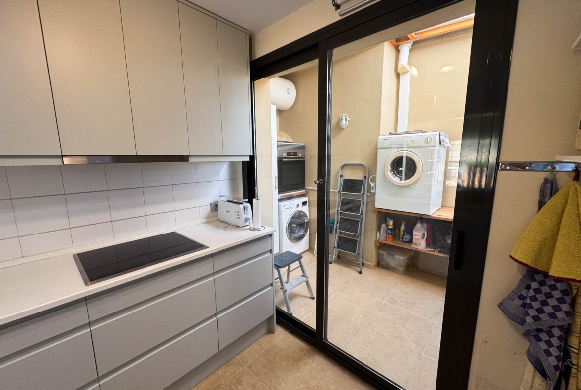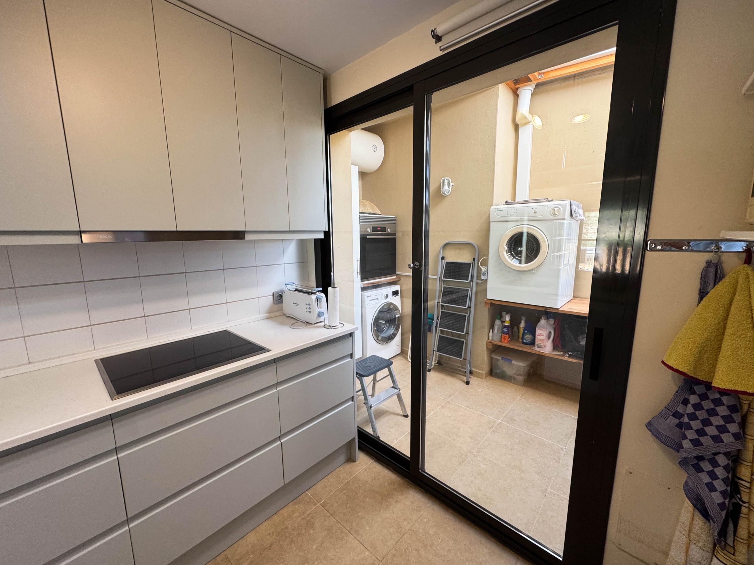 The kitchen, renovated just two years ago, is fully equipped and features a skylight in the laundry area that provides natural light, creating a welcoming and functional atmosphere. The jewel of this penthouse is its spectacular 34-square-meter terrace, perfect for enjoying the views and the Mediterranean climate.