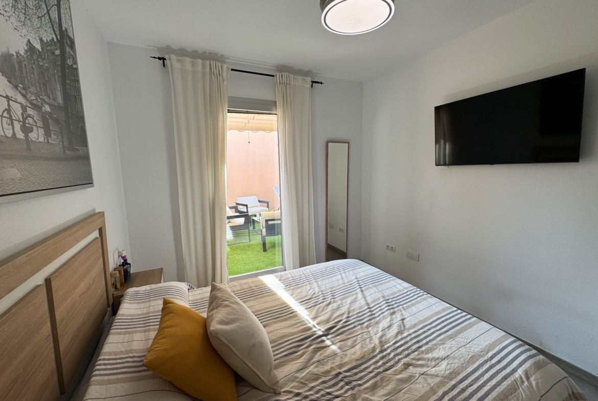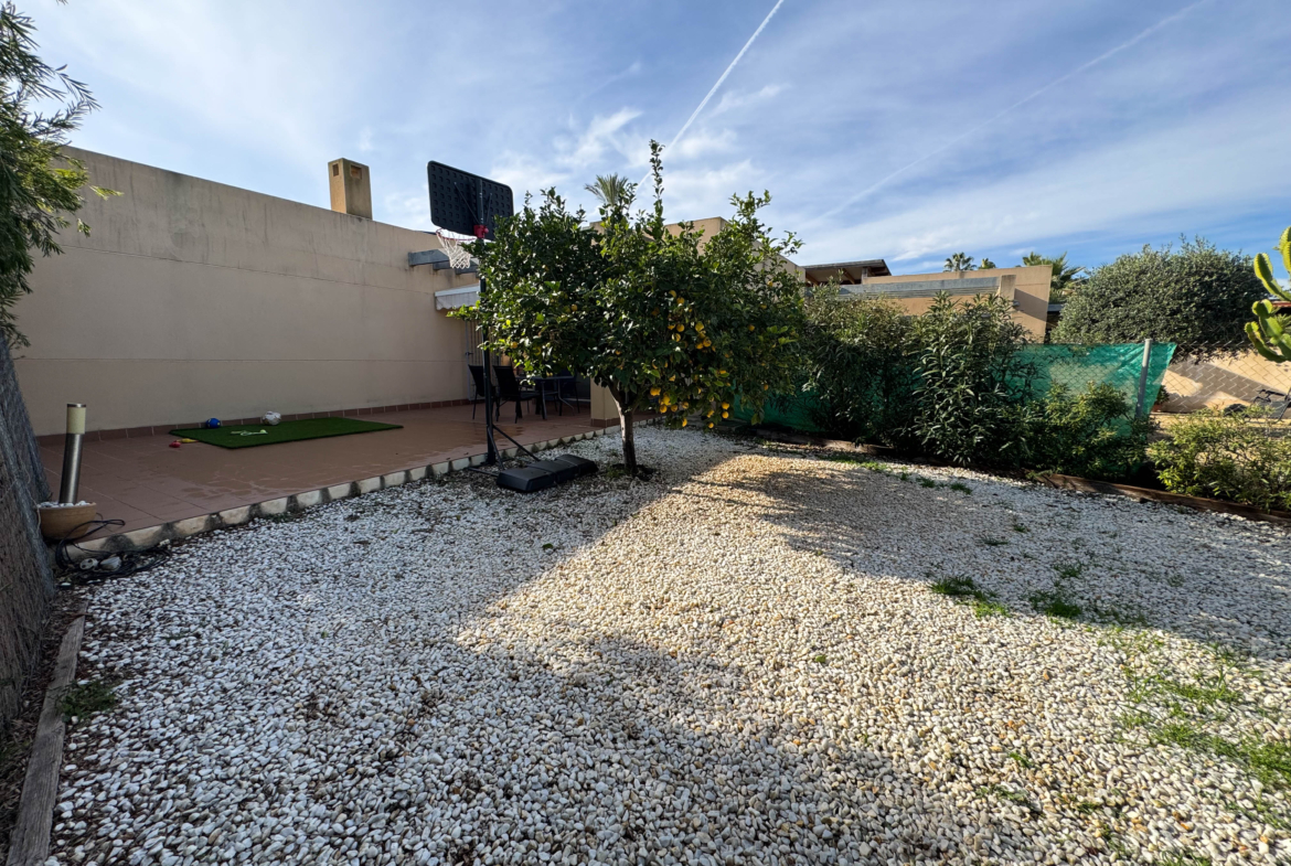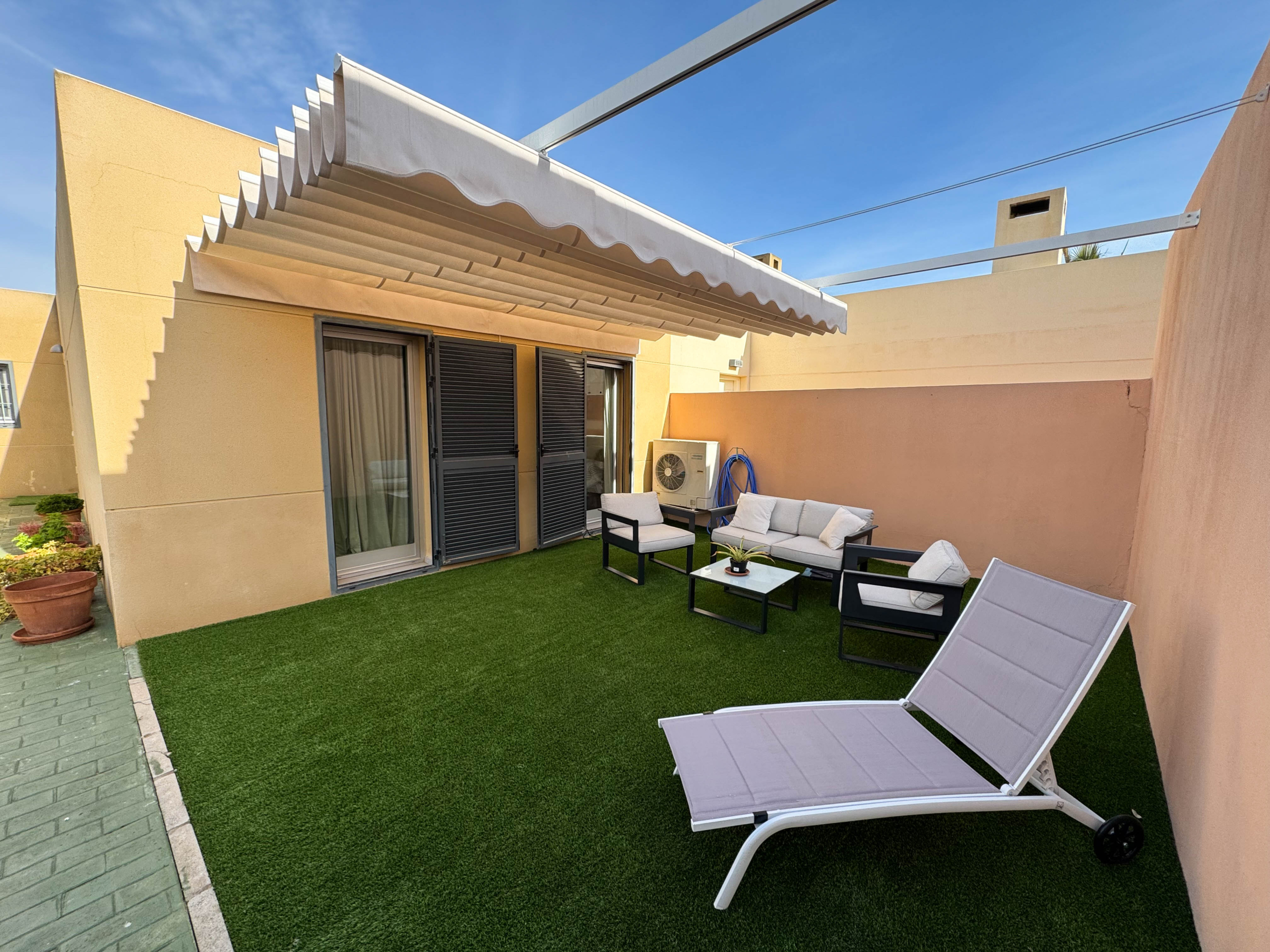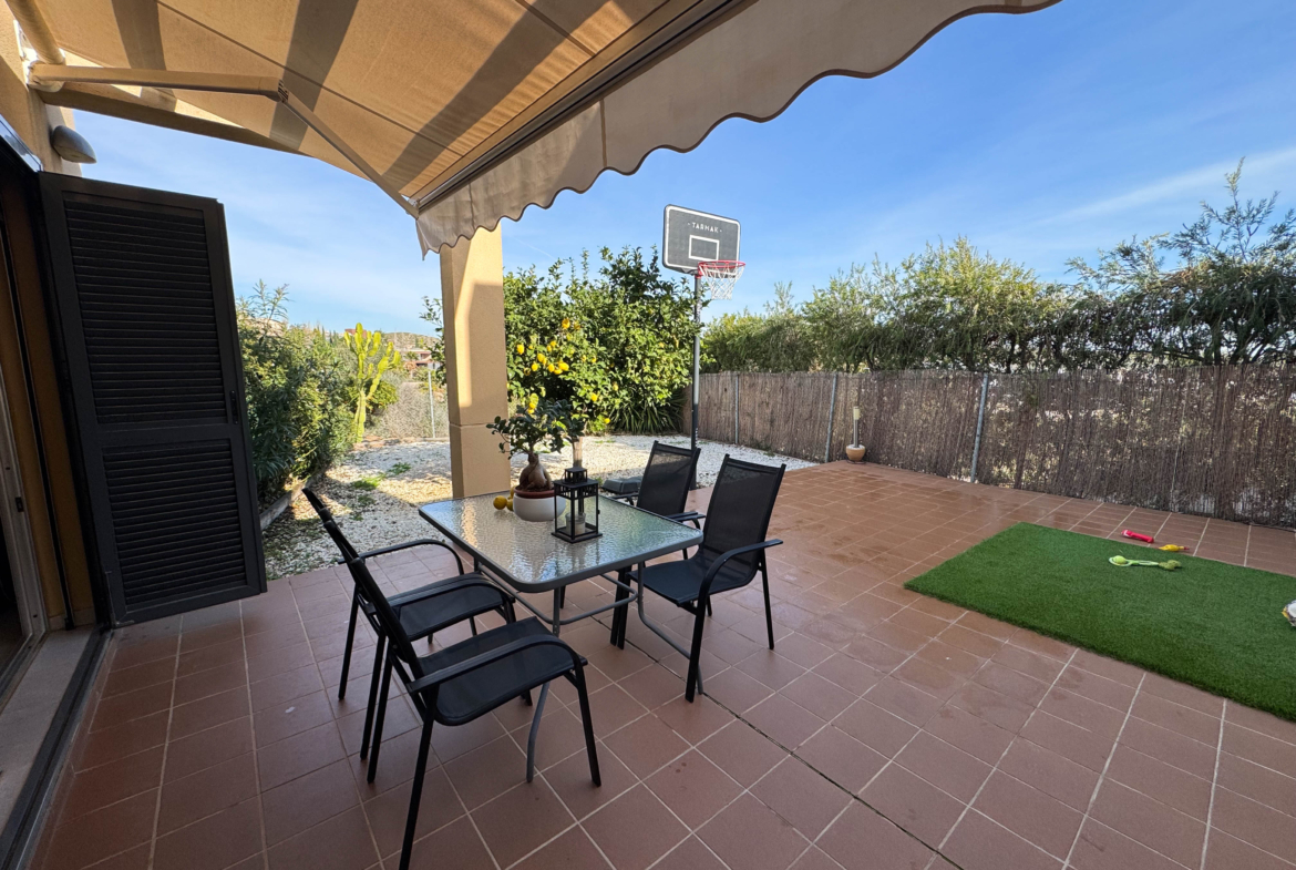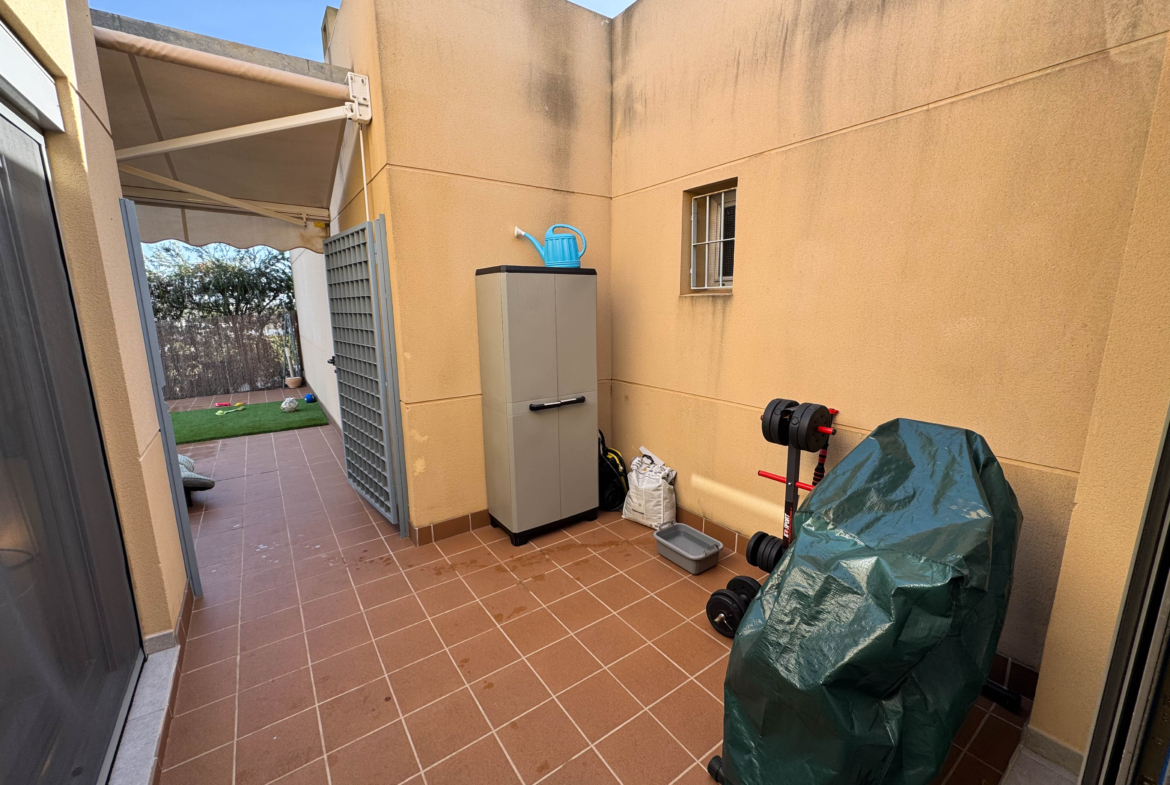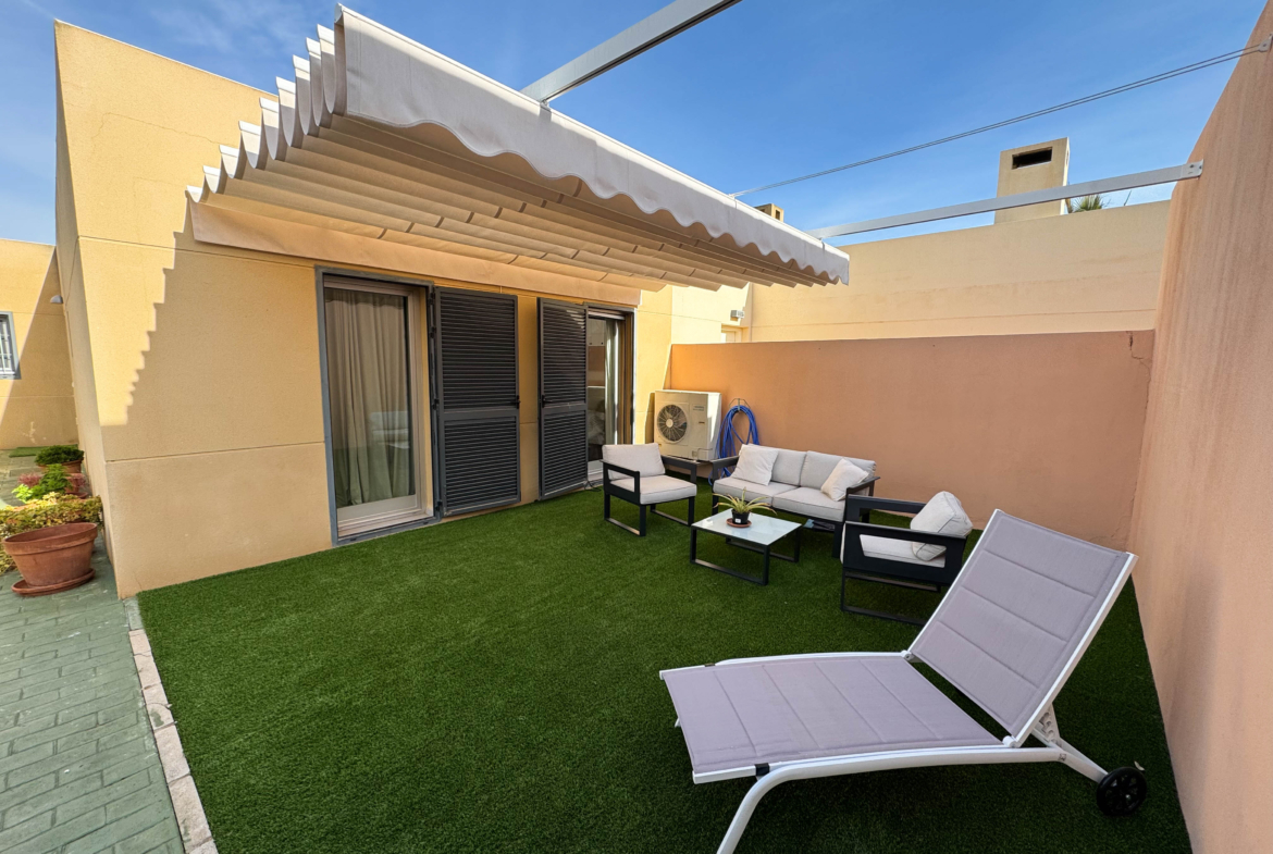 The property features terraces, a 58 m² back patio, and a 7 m² interior patio that has the potential to be converted into a third bedroom. An awning provides shade and comfort for enjoying the outdoors on sunny days. The development offers a communal swimming pool and beautiful gardens, perfect for relaxing and socializing with neighbors.