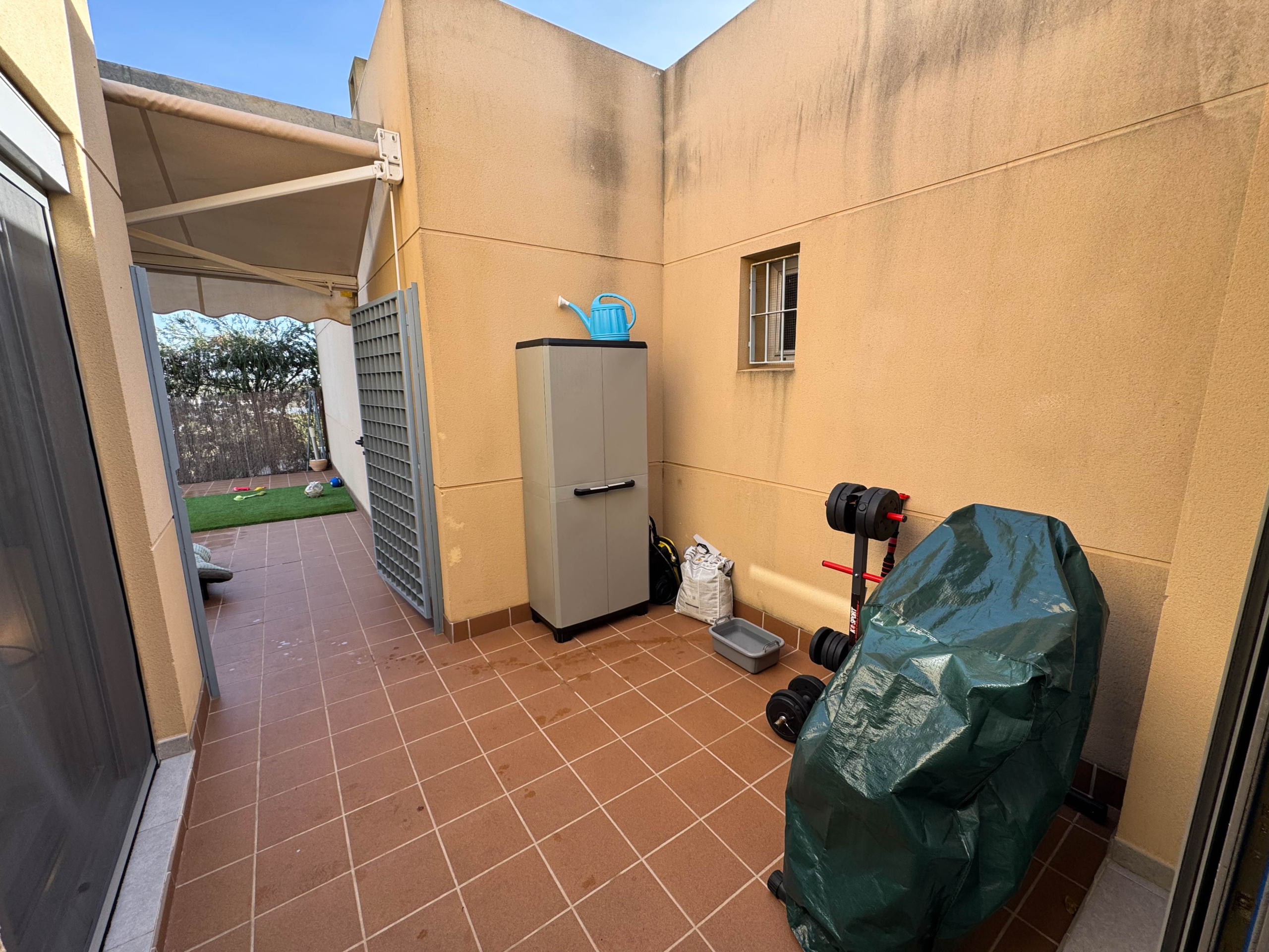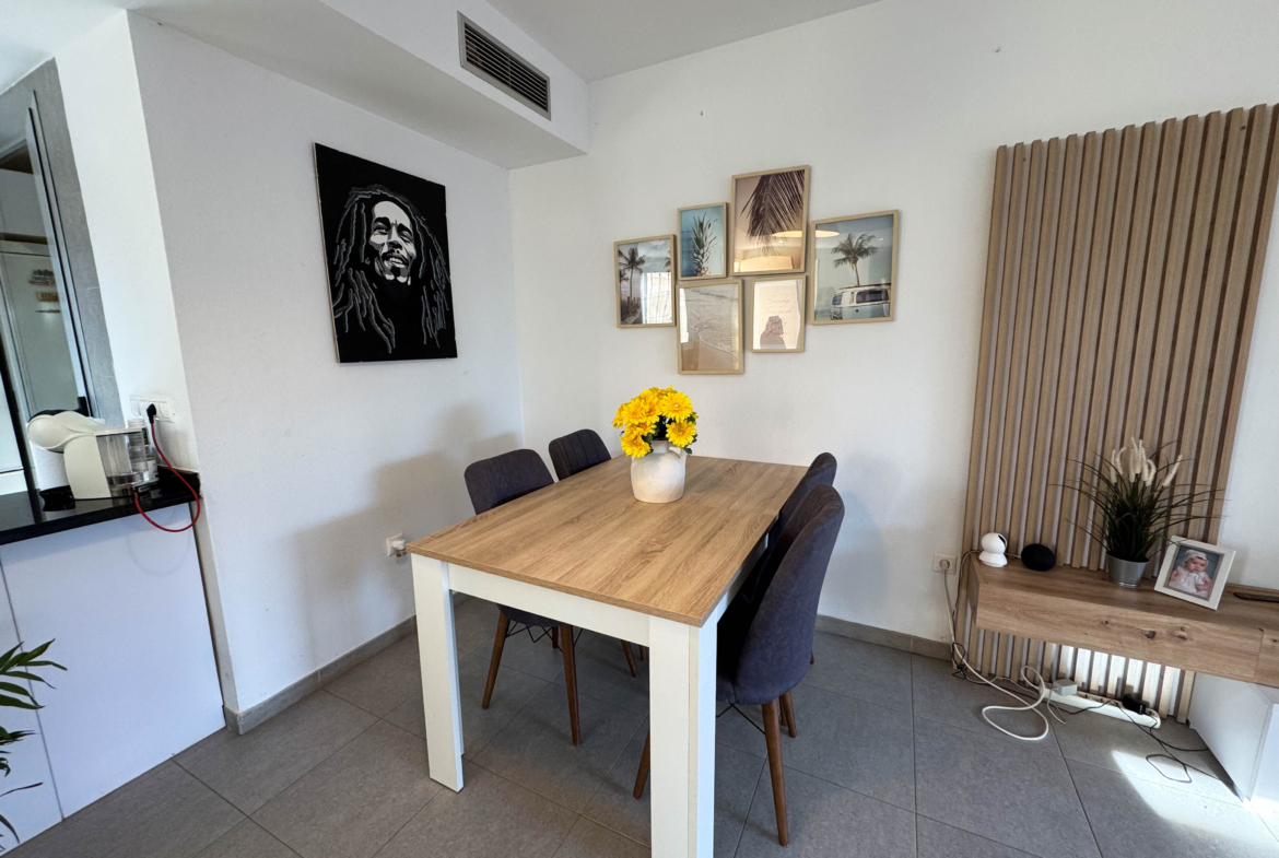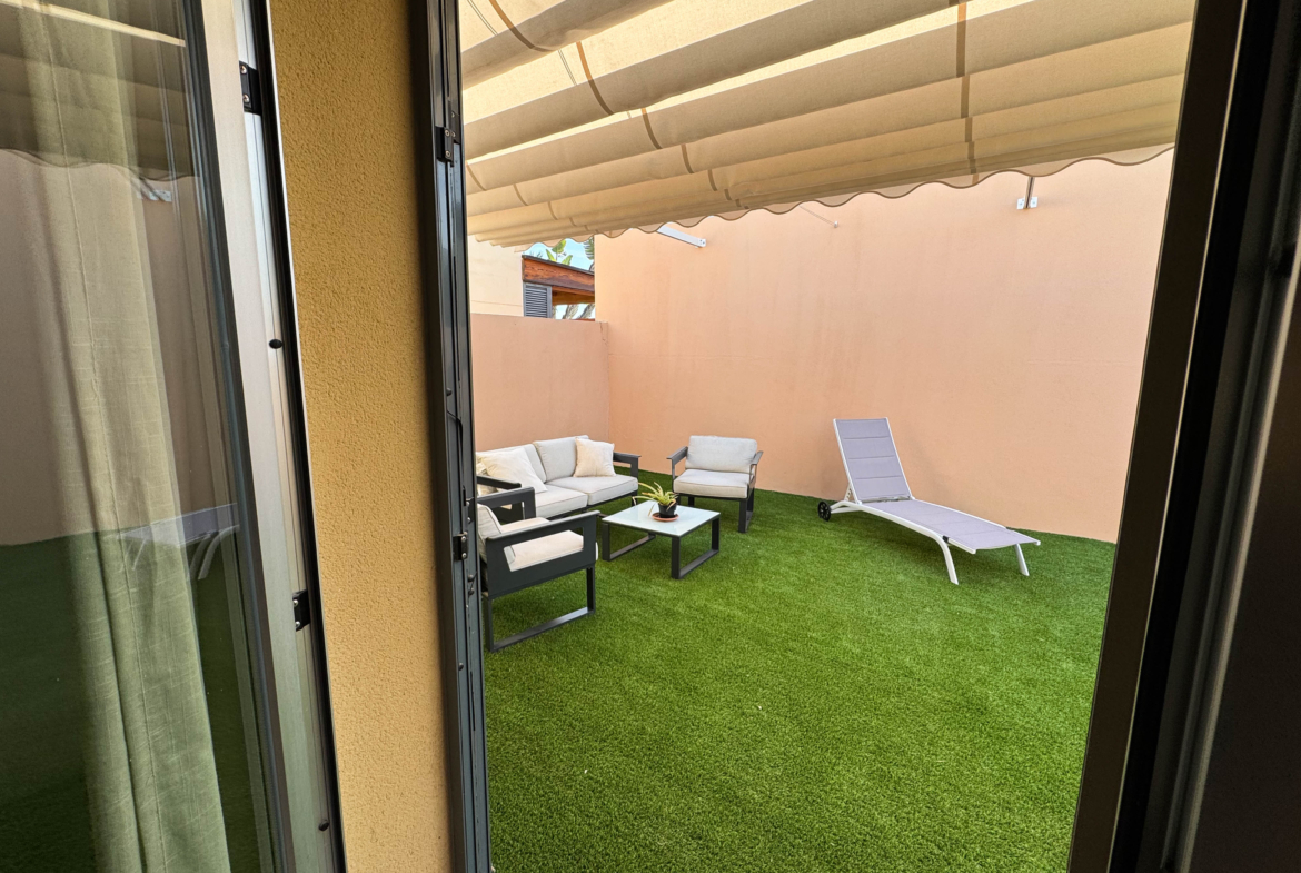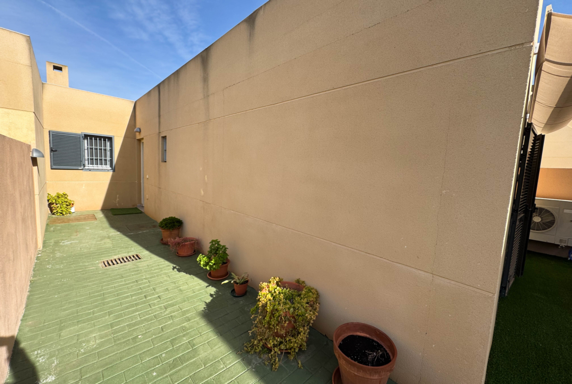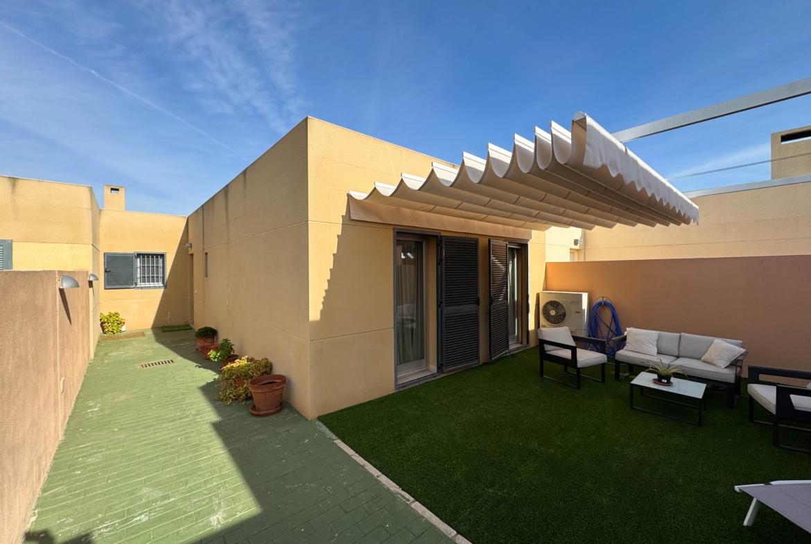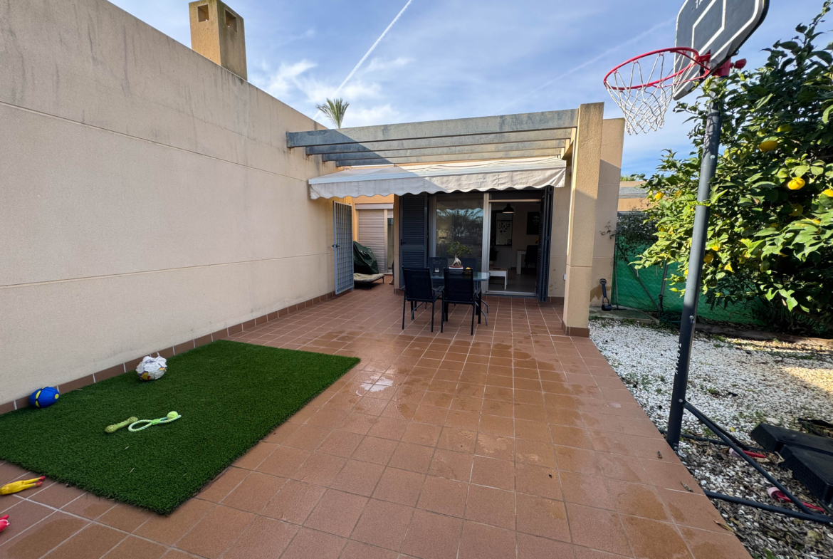 The property features terraces, a 58 m² back patio, and a 7 m² interior patio that has the potential to be converted into a third bedroom. An awning provides shade and comfort for enjoying the outdoors on sunny days. The development offers a communal swimming pool and beautiful gardens, perfect for relaxing and socializing with neighbors.
