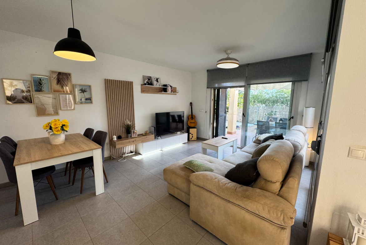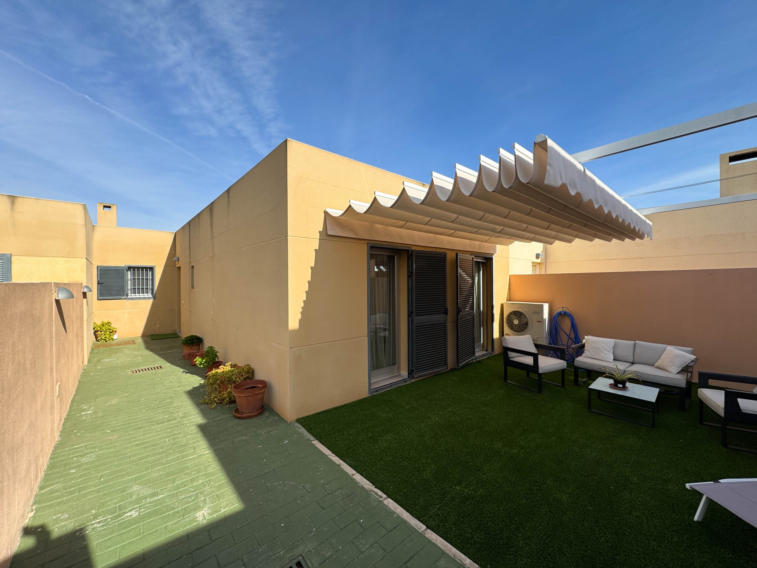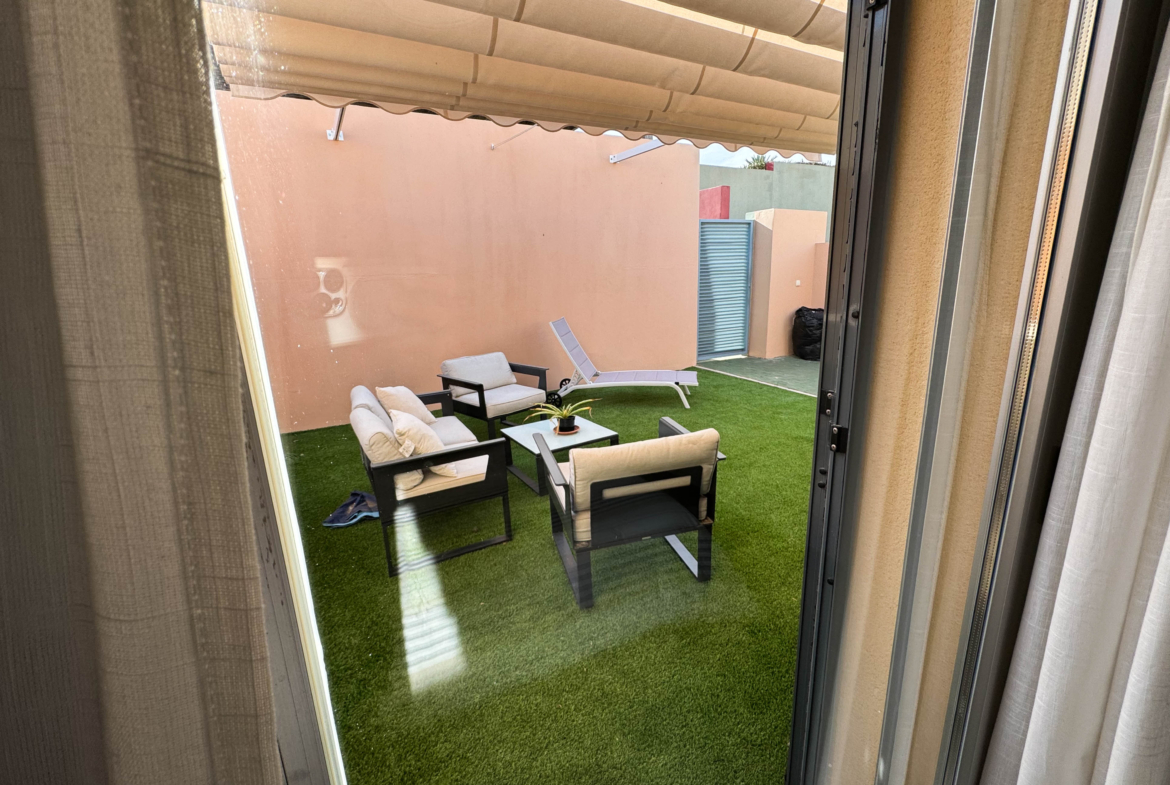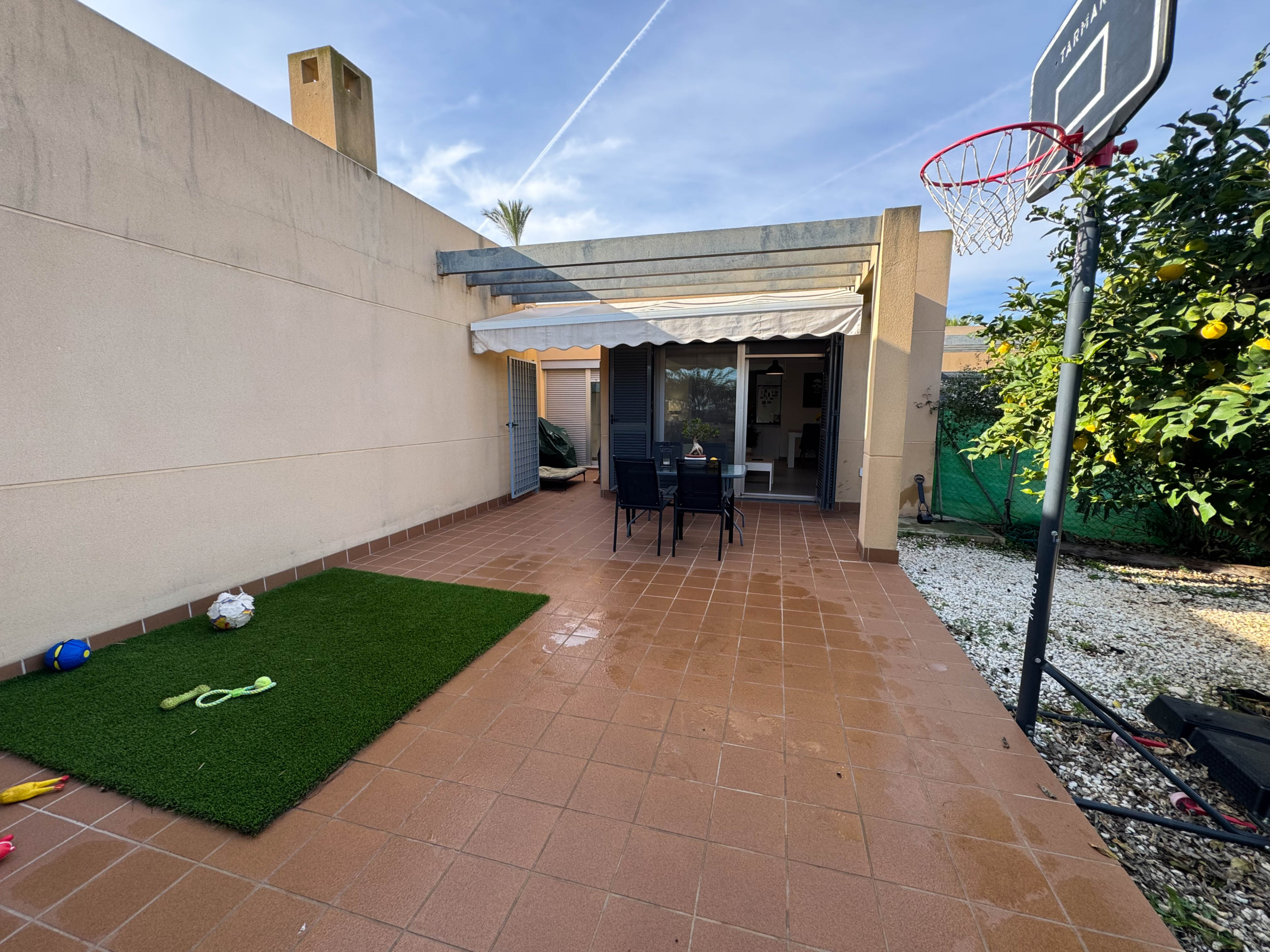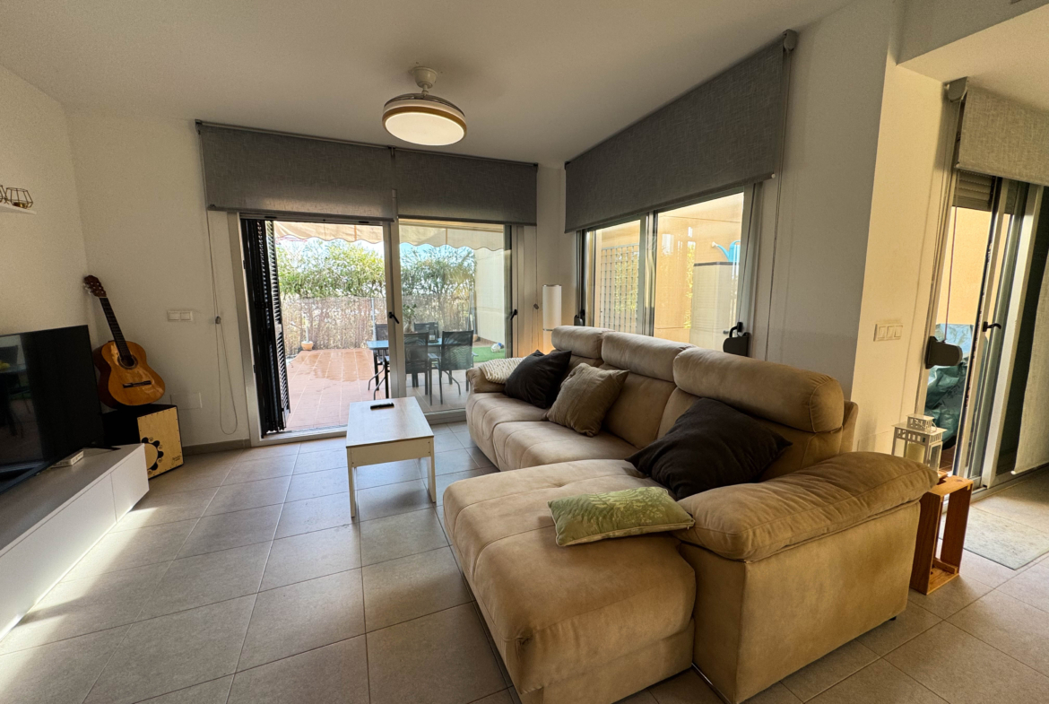 The property features terraces, a 58 m² back patio, and a 7 m² interior patio that has the potential to be converted into a third bedroom. An awning provides shade and comfort for enjoying the outdoors on sunny days. The development offers a communal swimming pool and beautiful gardens, perfect for relaxing and socializing with neighbors.