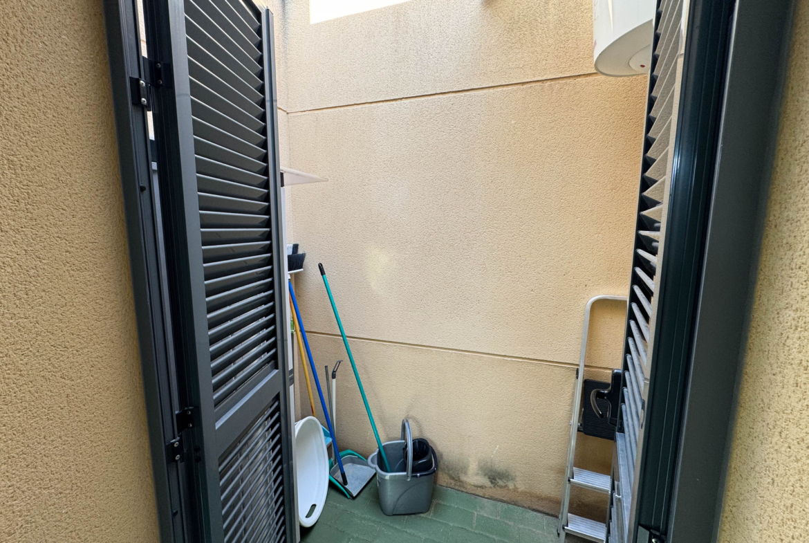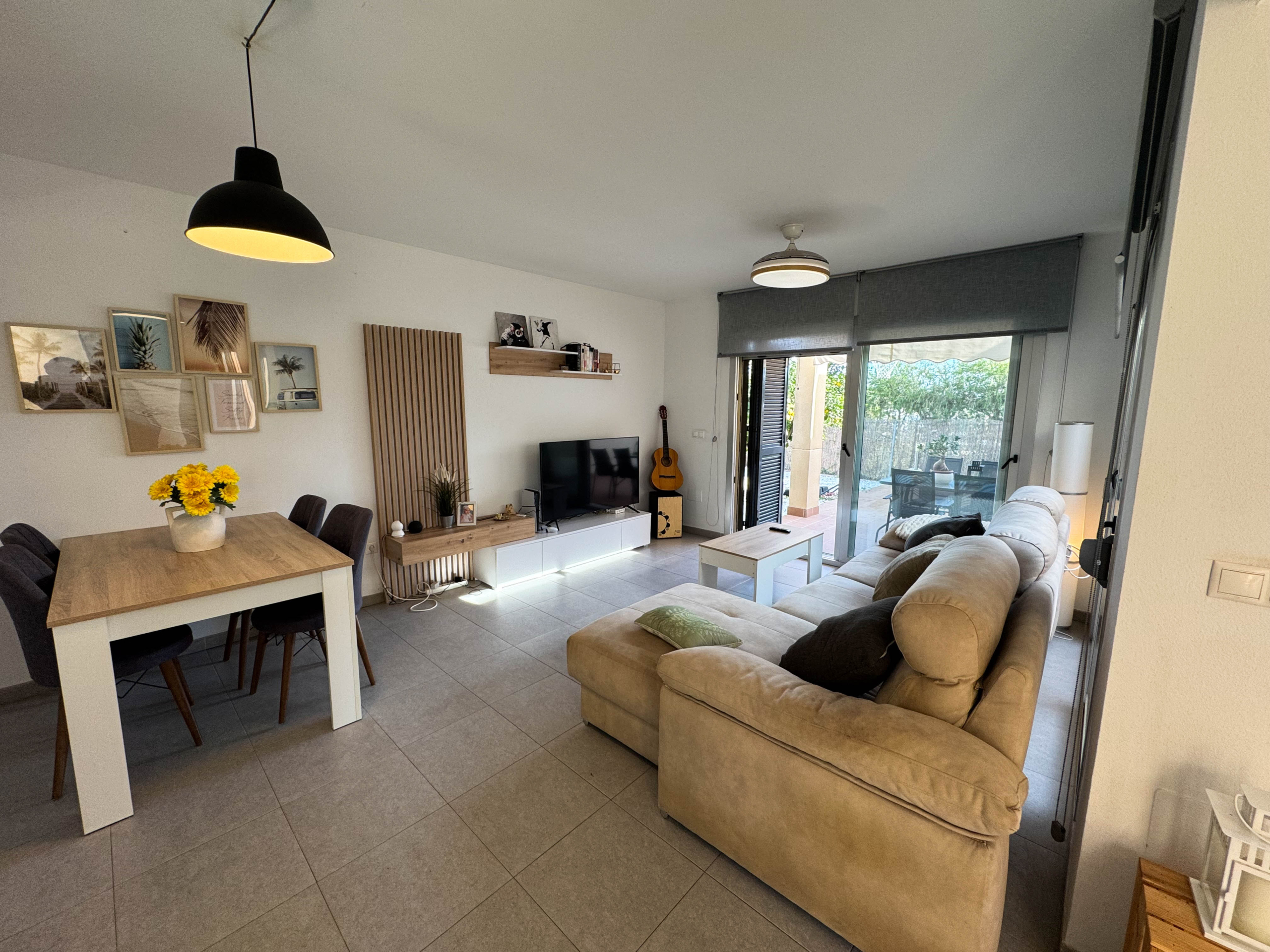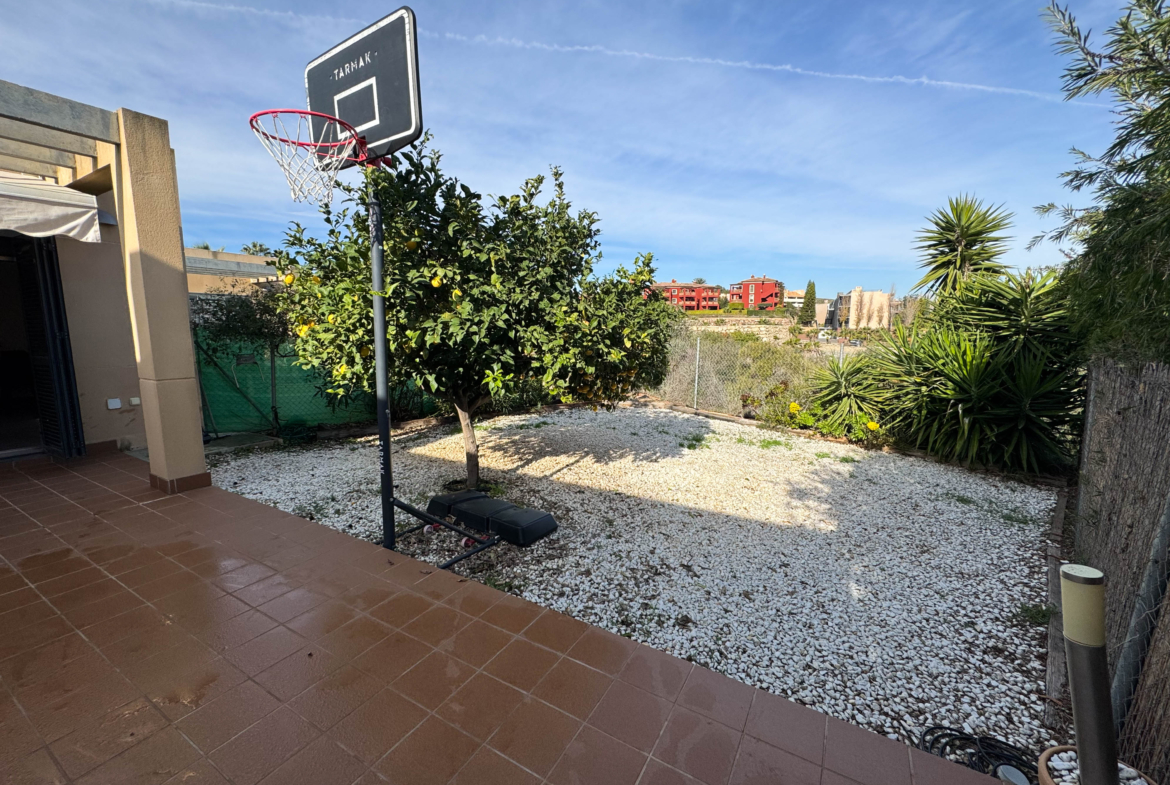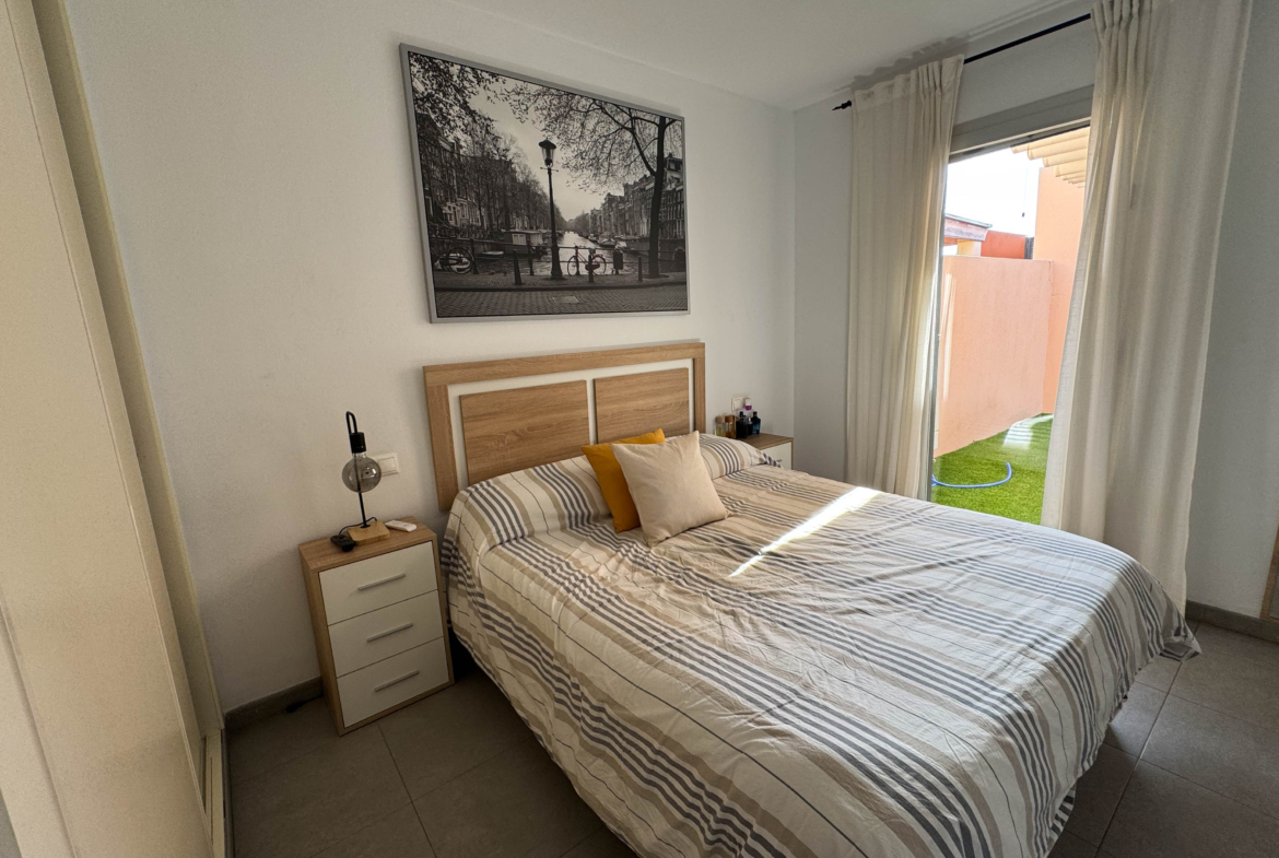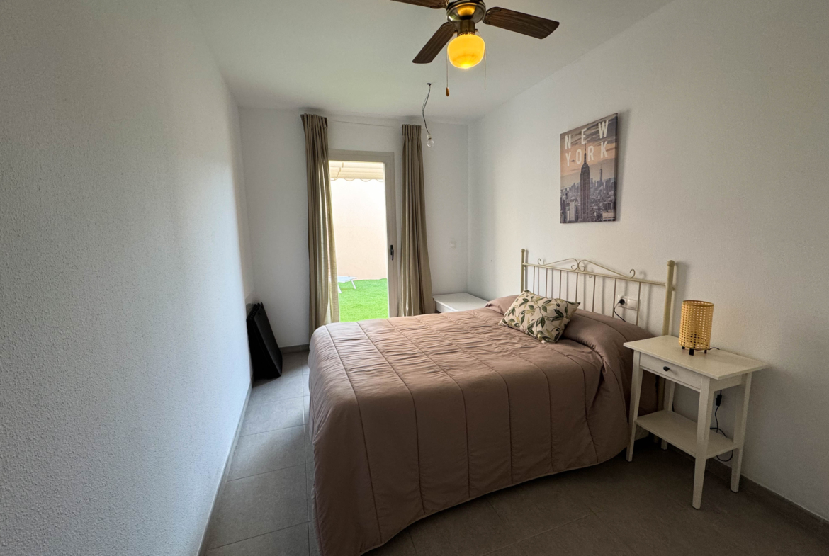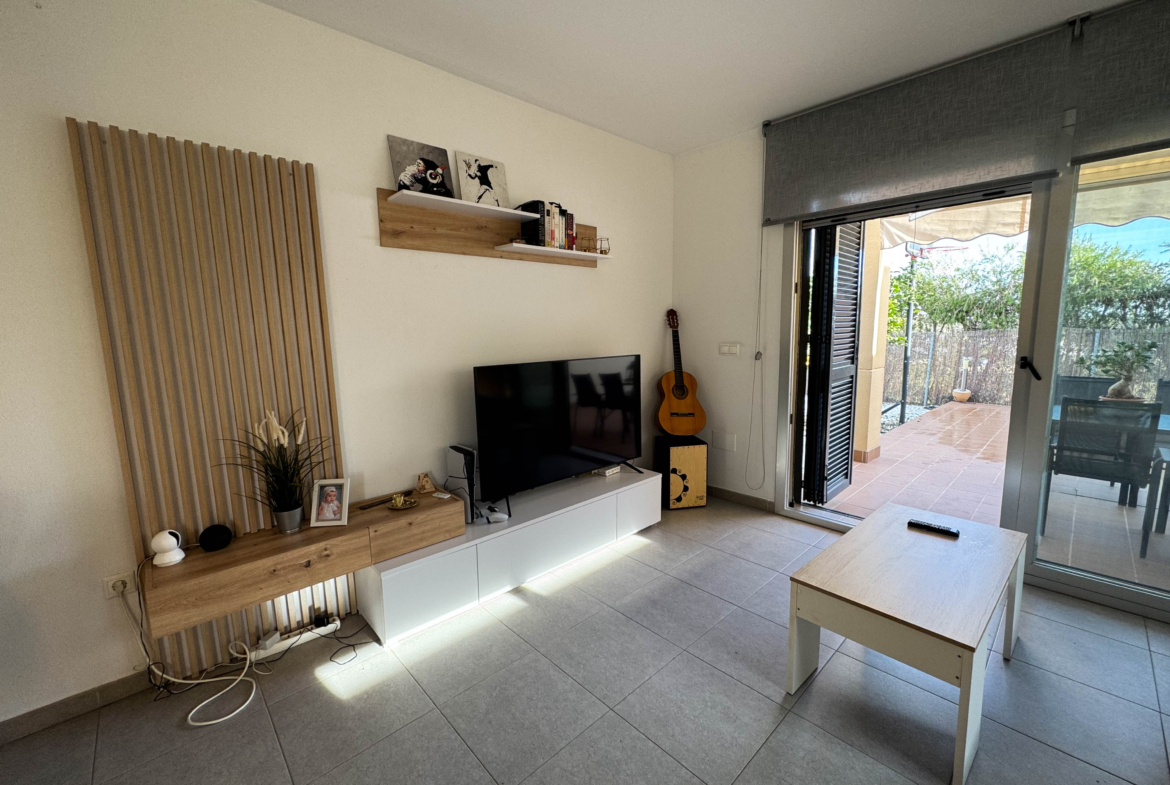 The property features terraces, a 58 m² back patio, and a 7 m² interior patio that has the potential to be converted into a third bedroom. An awning provides shade and comfort for enjoying the outdoors on sunny days. The development offers a communal swimming pool and beautiful gardens, perfect for relaxing and socializing with neighbors.