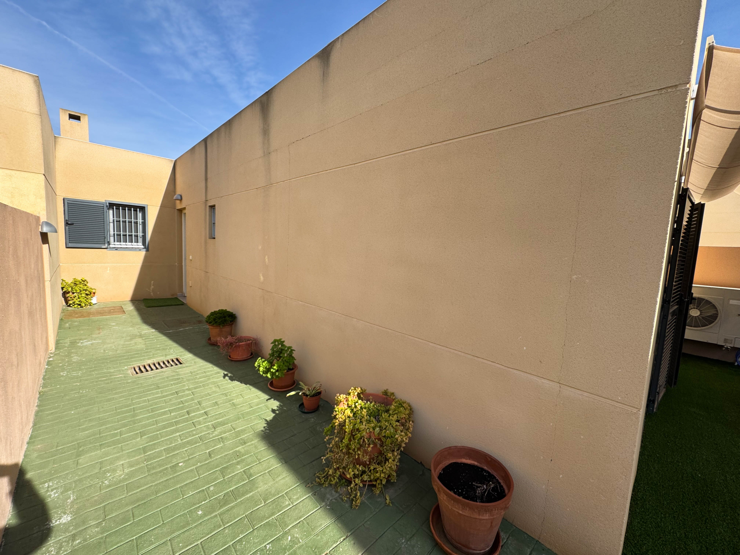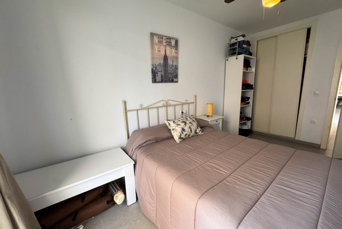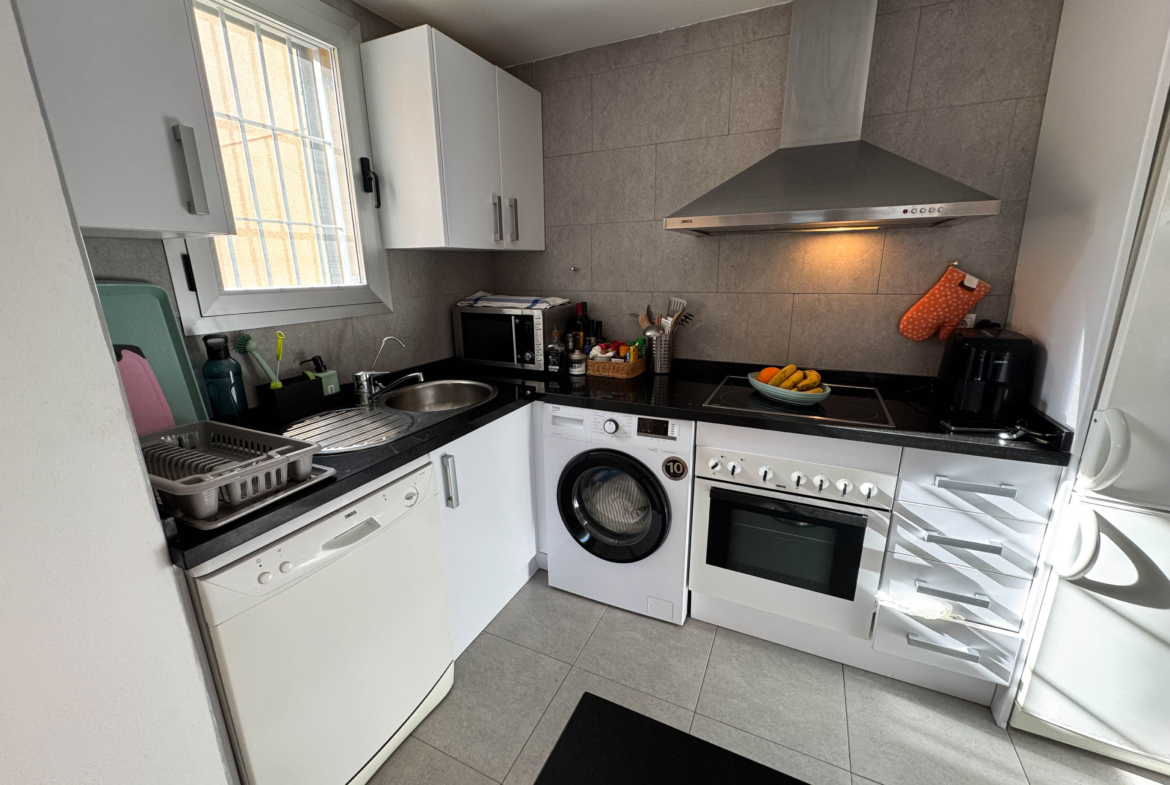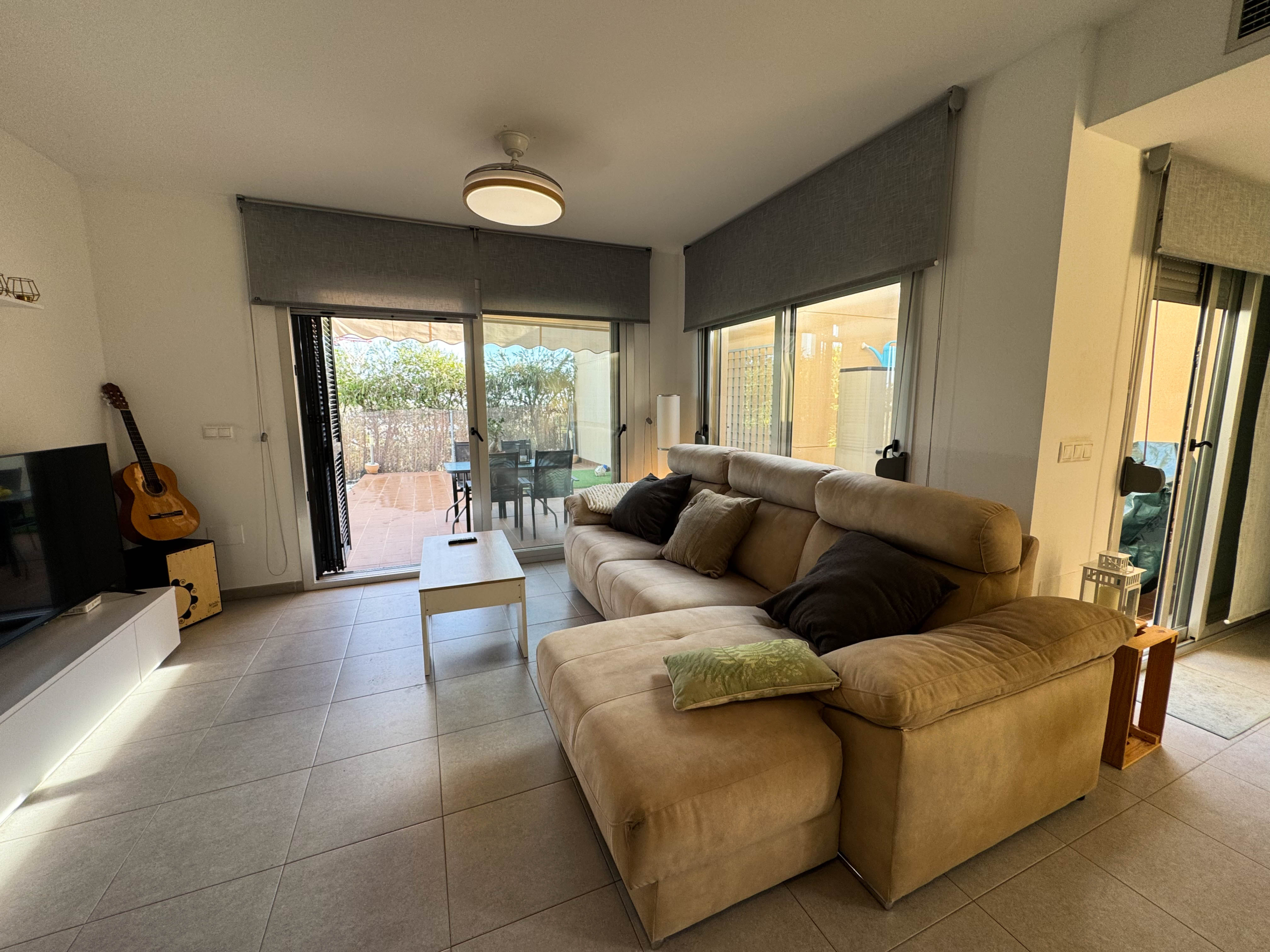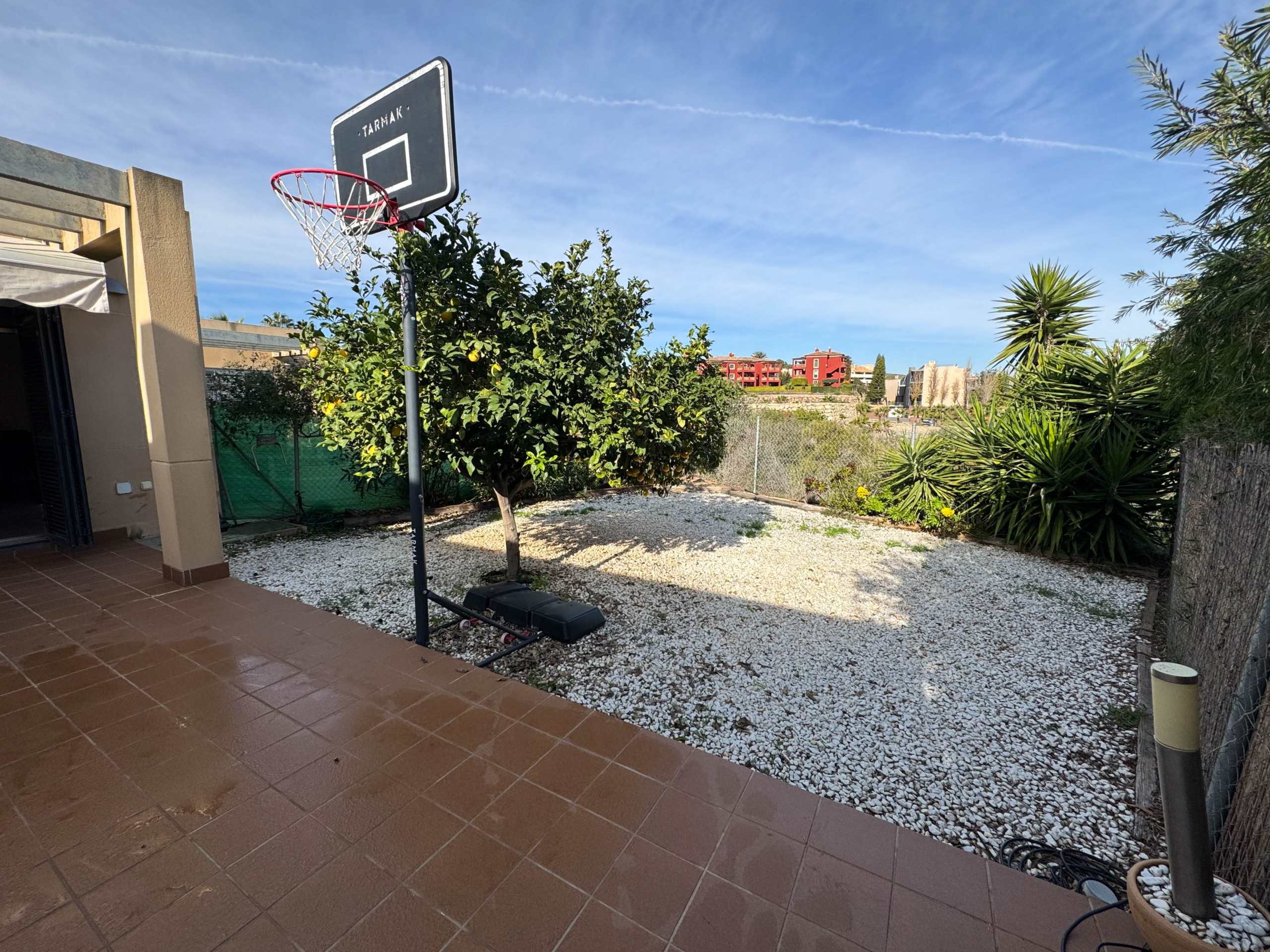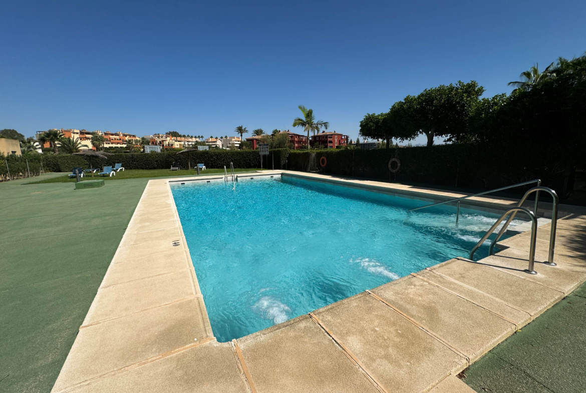 The property features terraces, a 58 m² back patio, and a 7 m² interior patio that has the potential to be converted into a third bedroom. An awning provides shade and comfort for enjoying the outdoors on sunny days. The development offers a communal swimming pool and beautiful gardens, perfect for relaxing and socializing with neighbors.