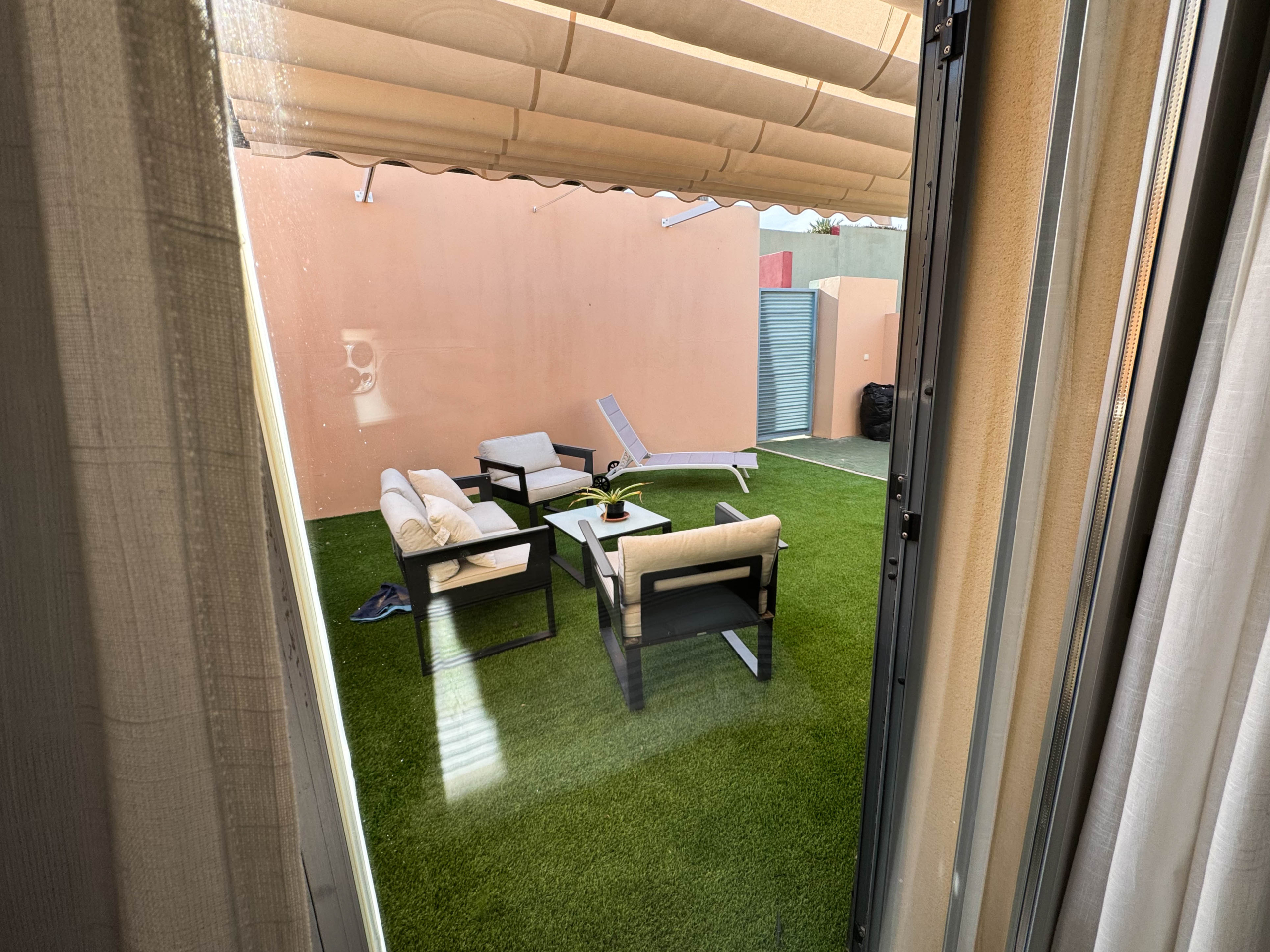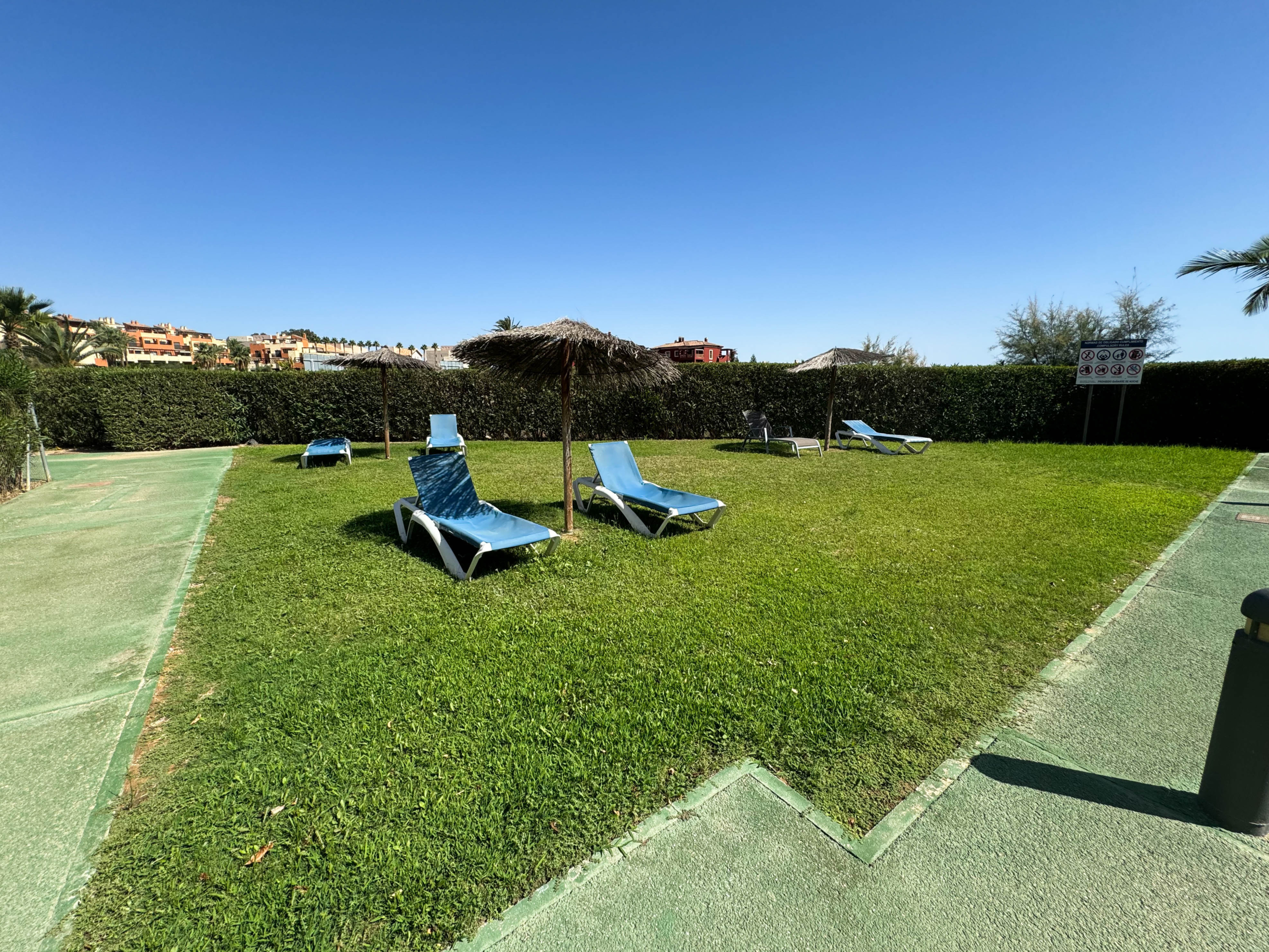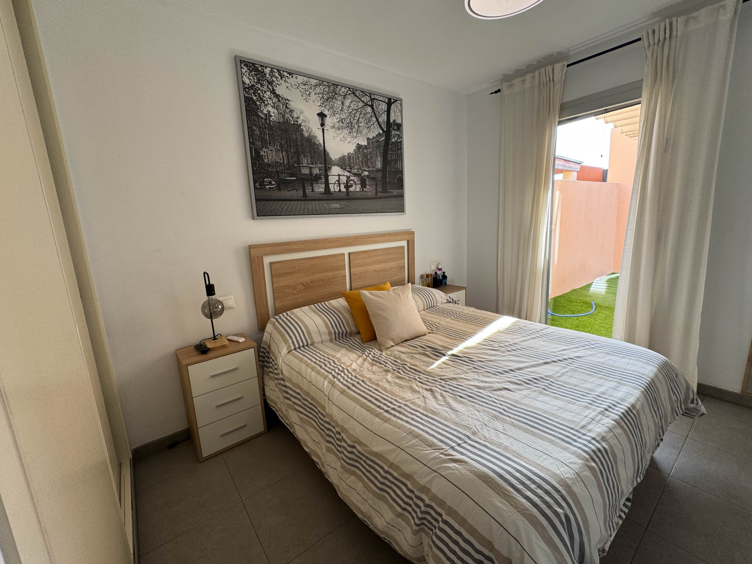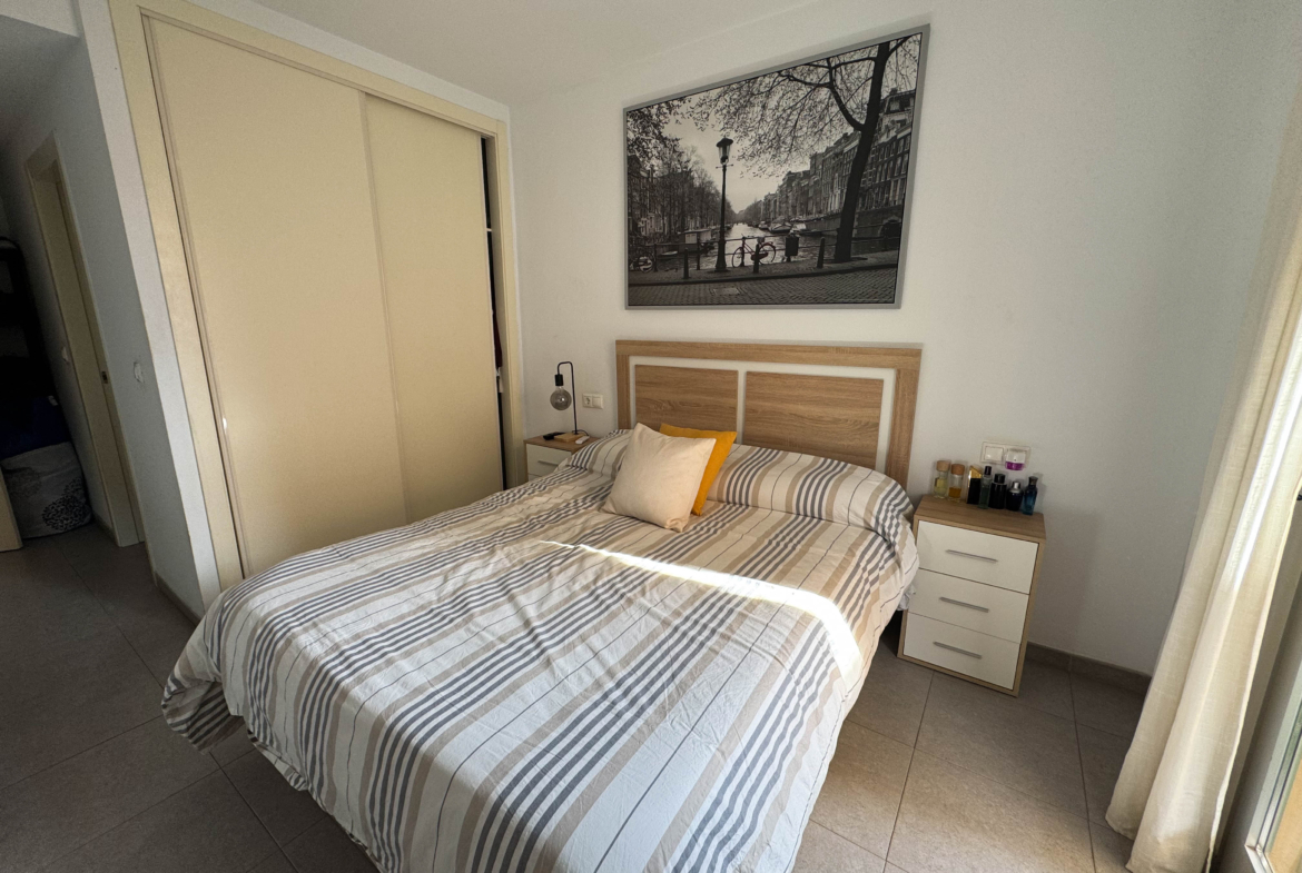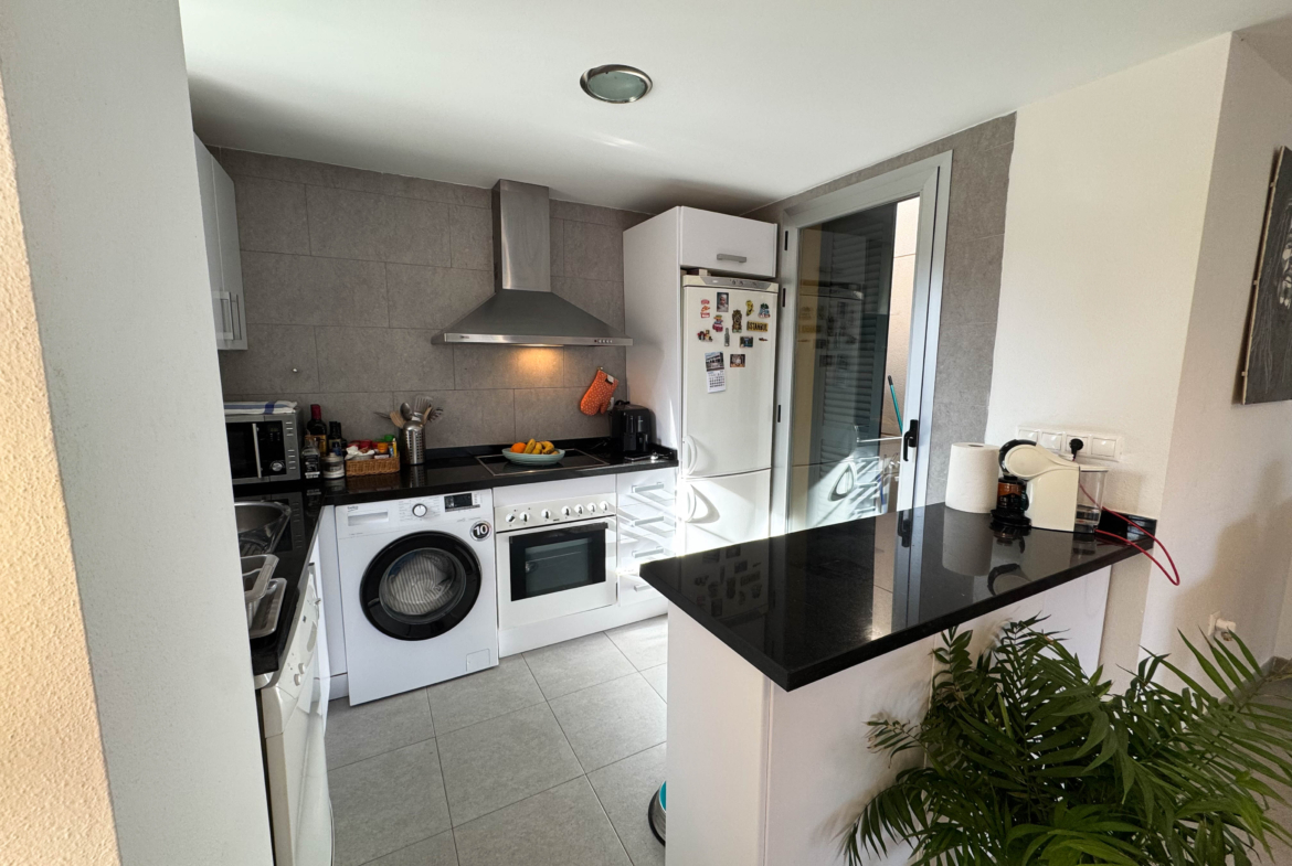 The property features terraces, a 58 m² back patio, and a 7 m² interior patio that has the potential to be converted into a third bedroom. An awning provides shade and comfort for enjoying the outdoors on sunny days. The development offers a communal swimming pool and beautiful gardens, perfect for relaxing and socializing with neighbors.
