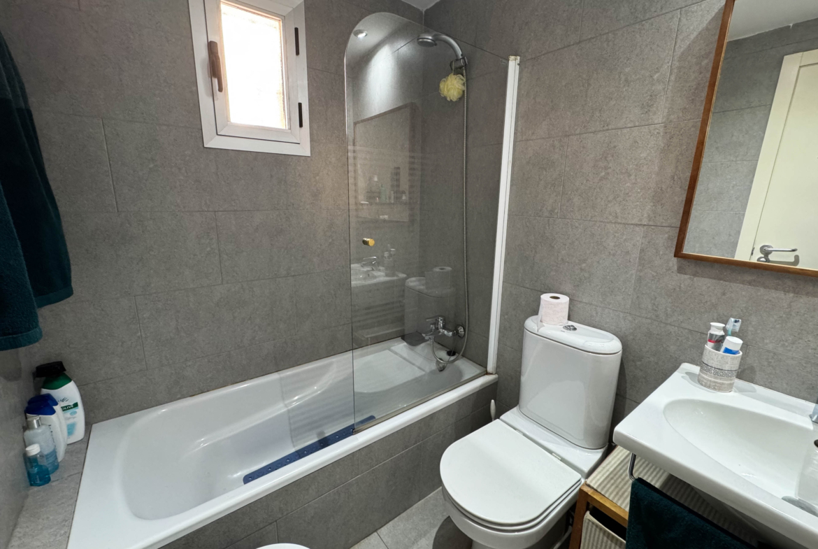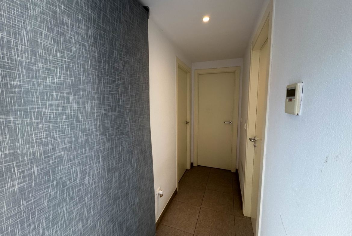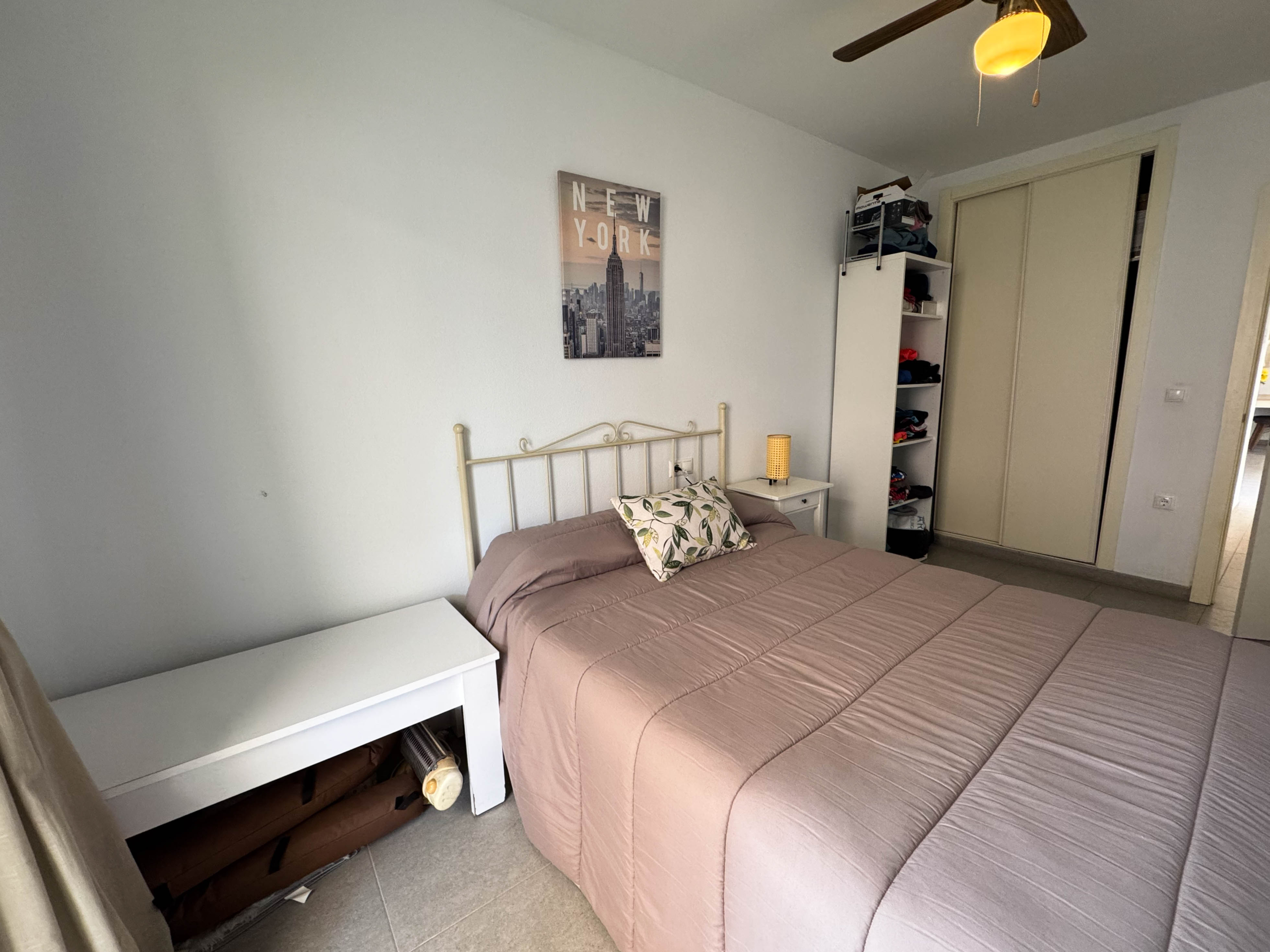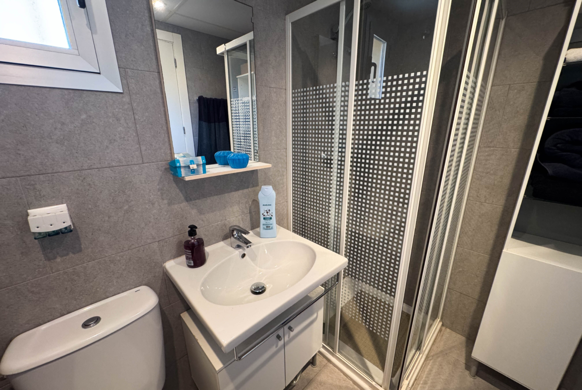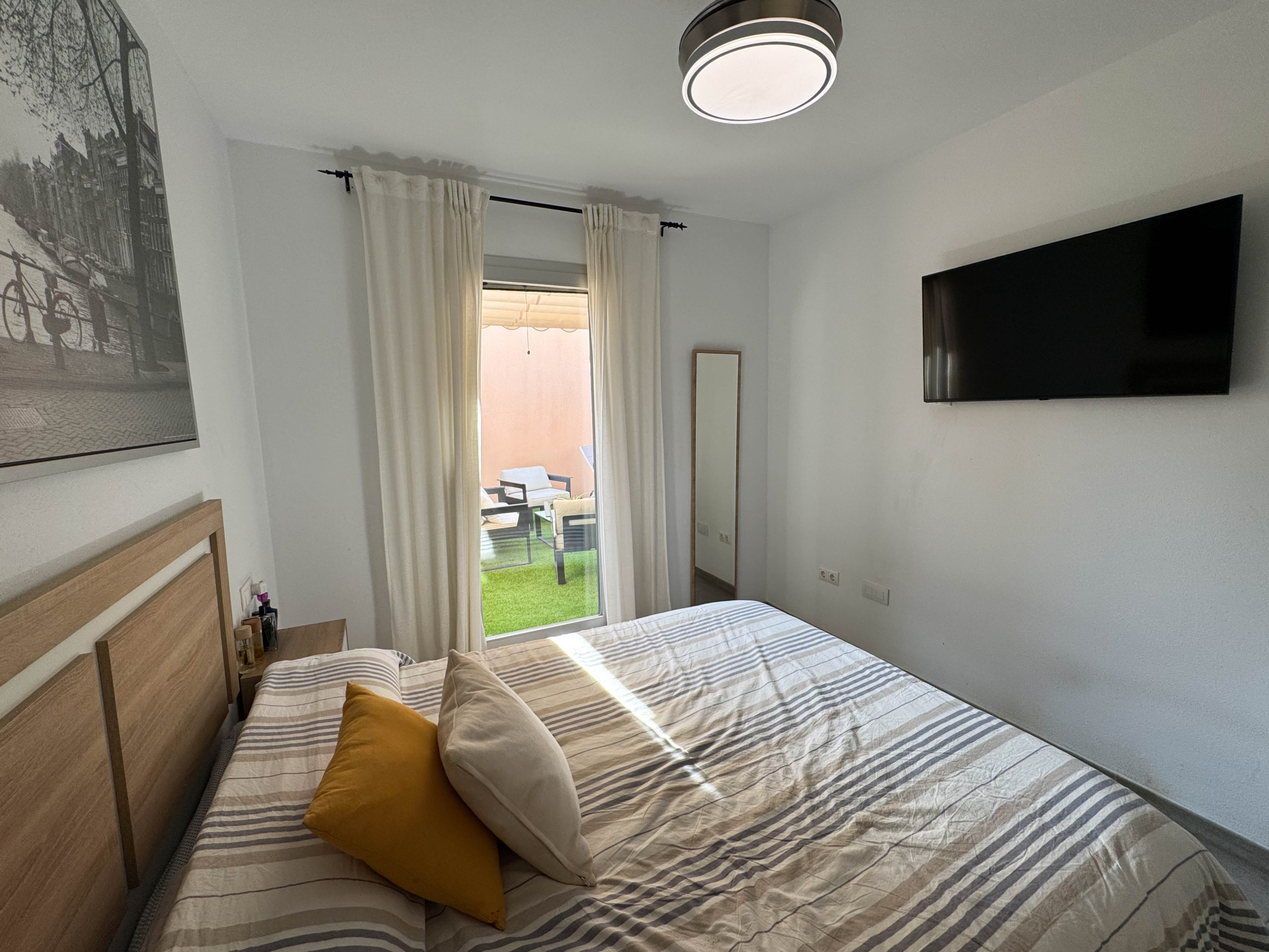 The property features terraces, a 58 m² back patio, and a 7 m² interior patio that has the potential to be converted into a third bedroom. An awning provides shade and comfort for enjoying the outdoors on sunny days. The development offers a communal swimming pool and beautiful gardens, perfect for relaxing and socializing with neighbors.
