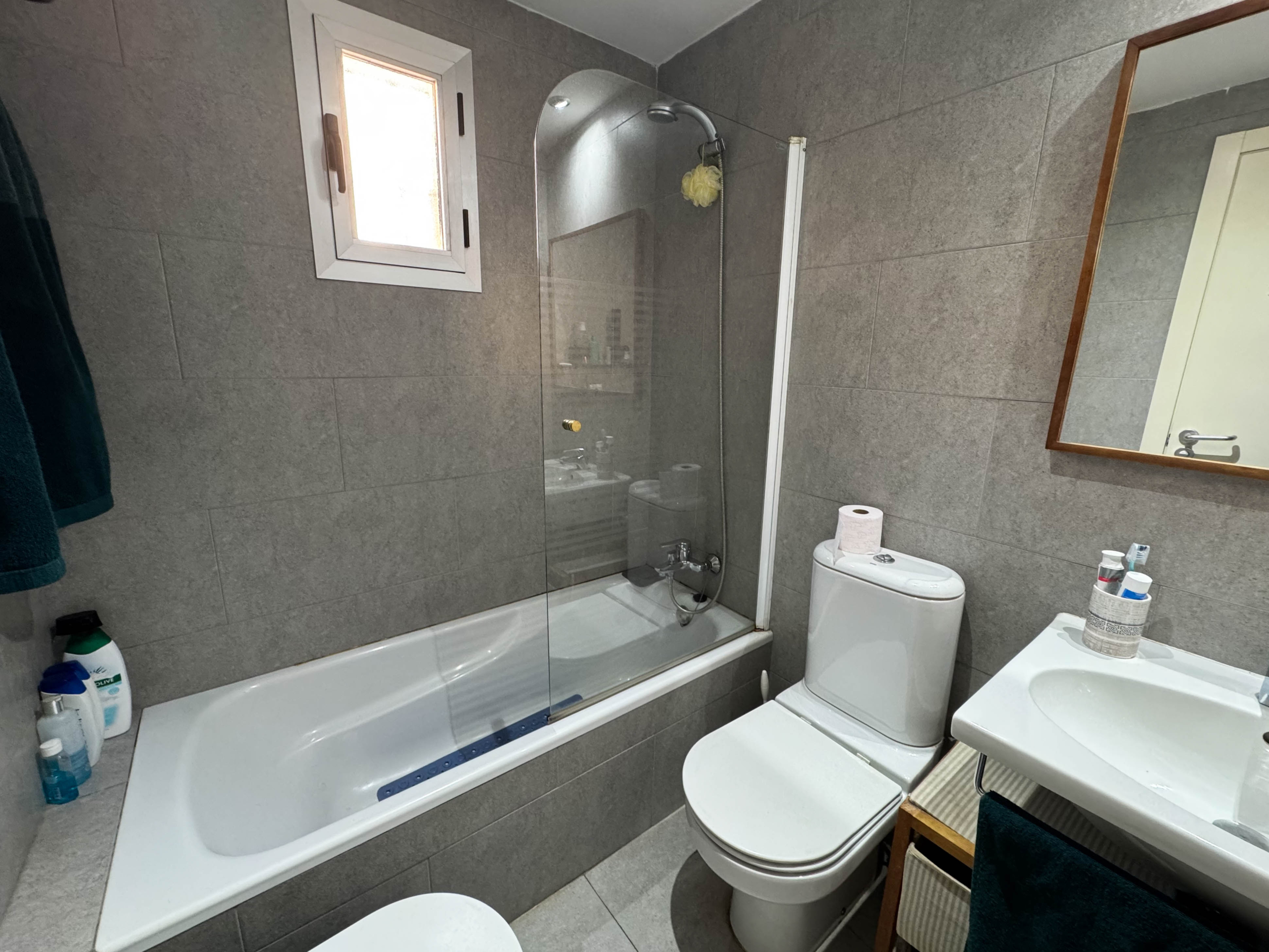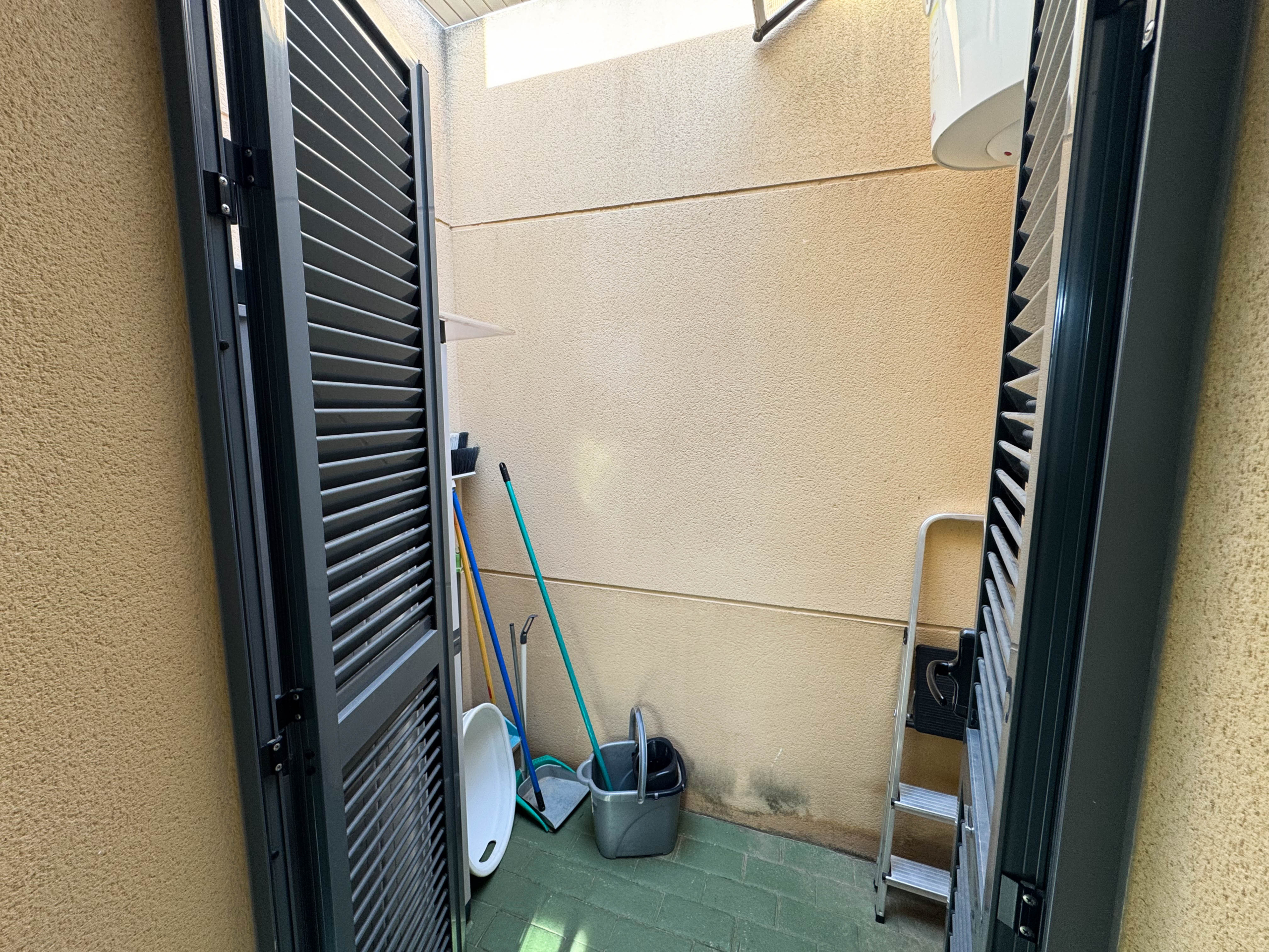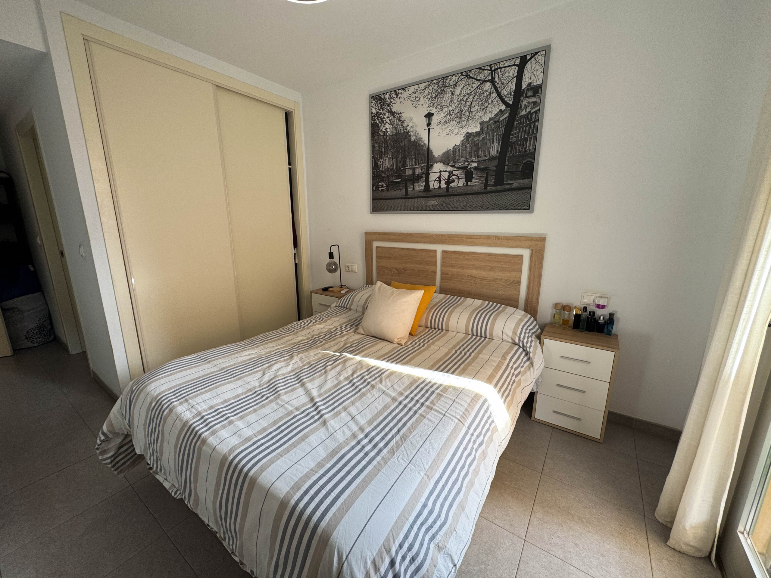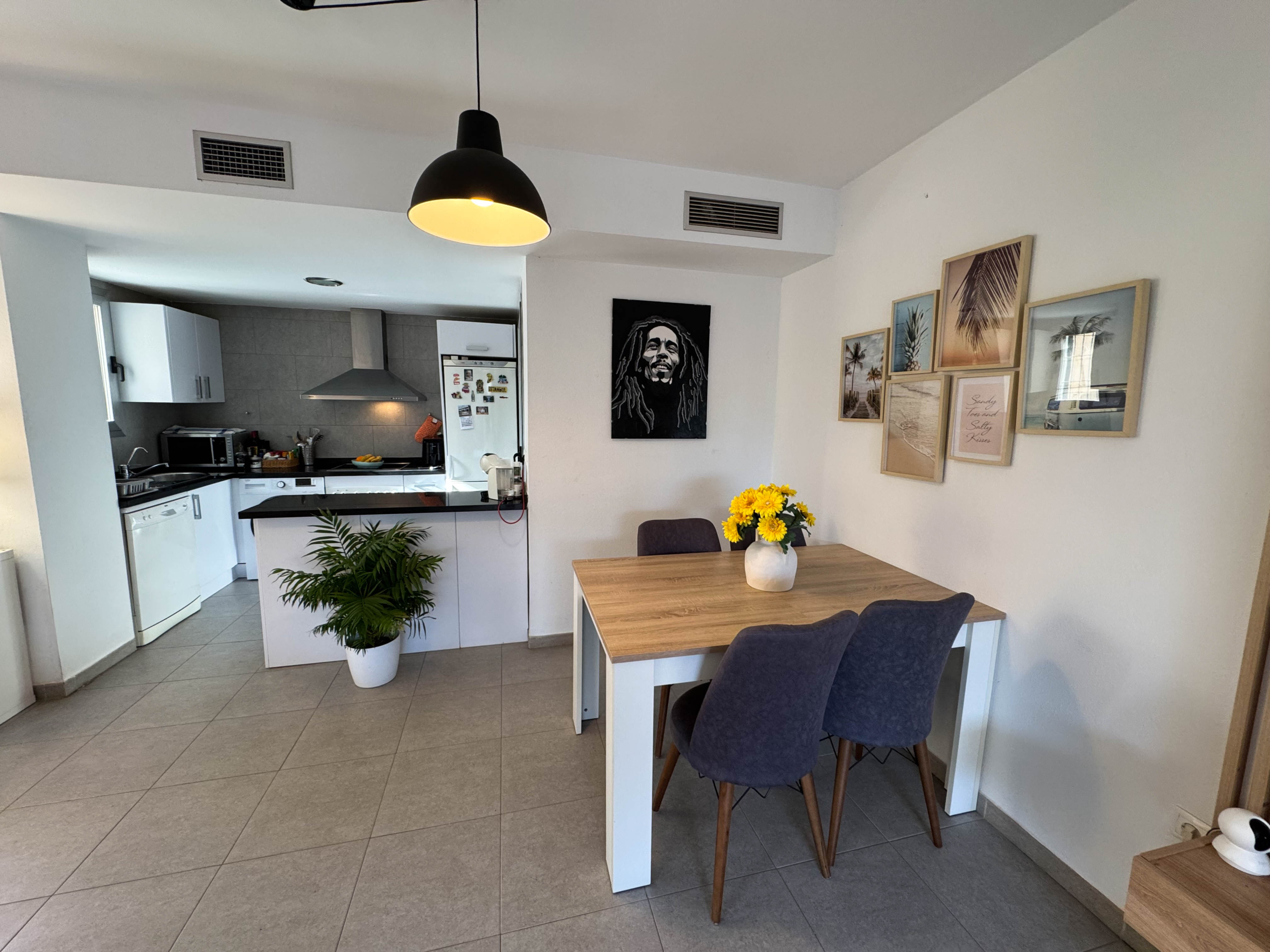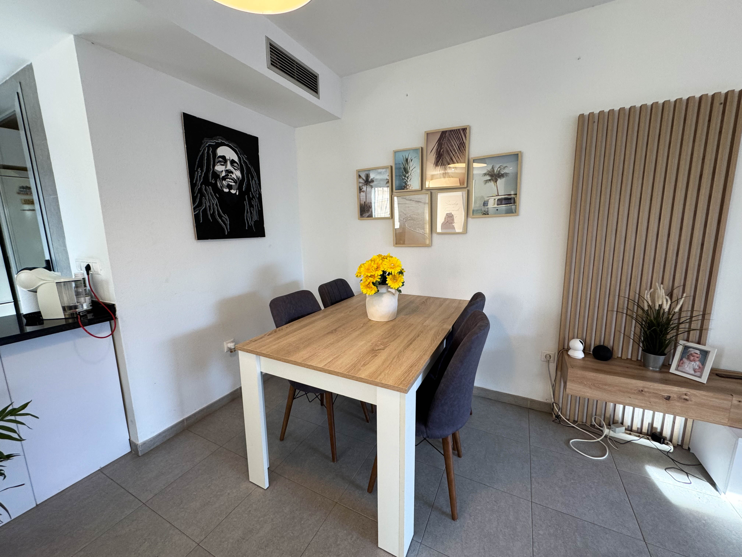 The property features terraces, a 58 m² back patio, and a 7 m² interior patio that has the potential to be converted into a third bedroom. An awning provides shade and comfort for enjoying the outdoors on sunny days. The development offers a communal swimming pool and beautiful gardens, perfect for relaxing and socializing with neighbors.