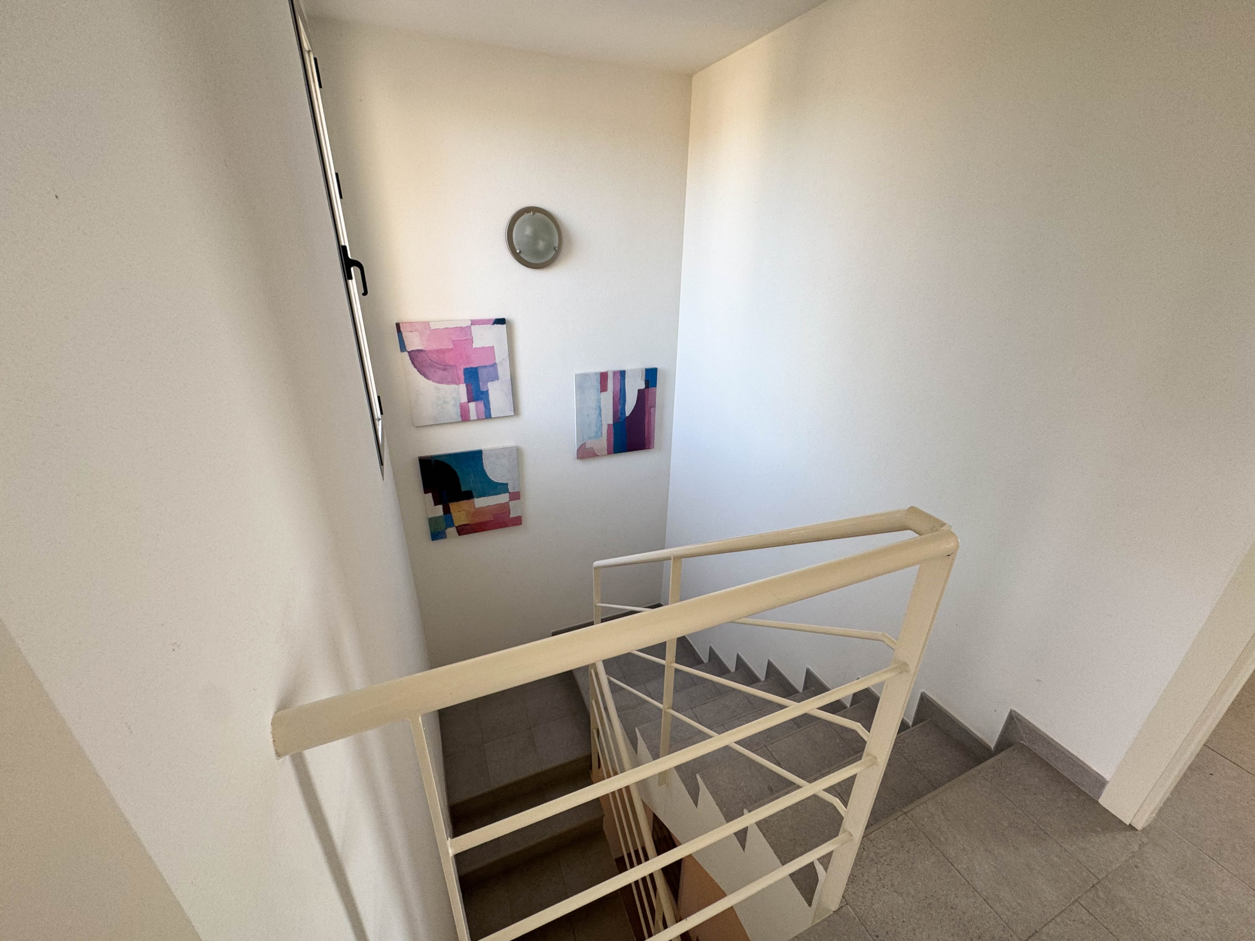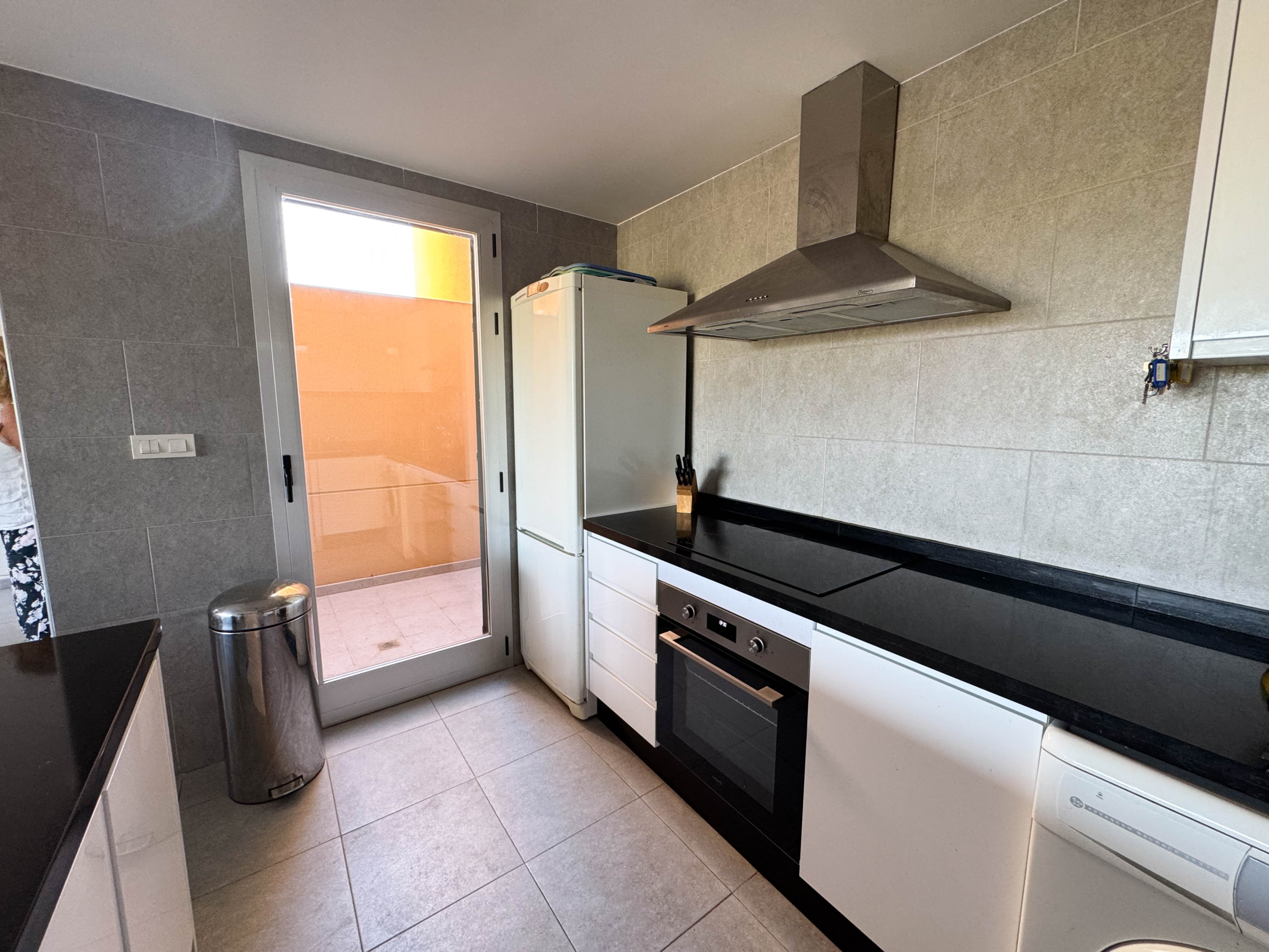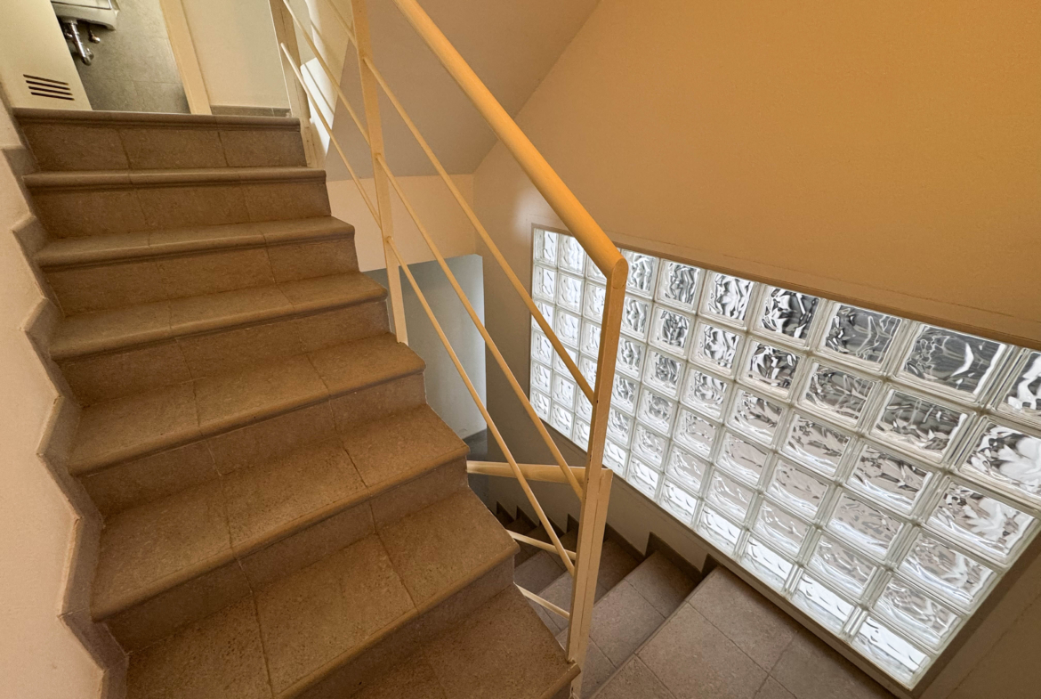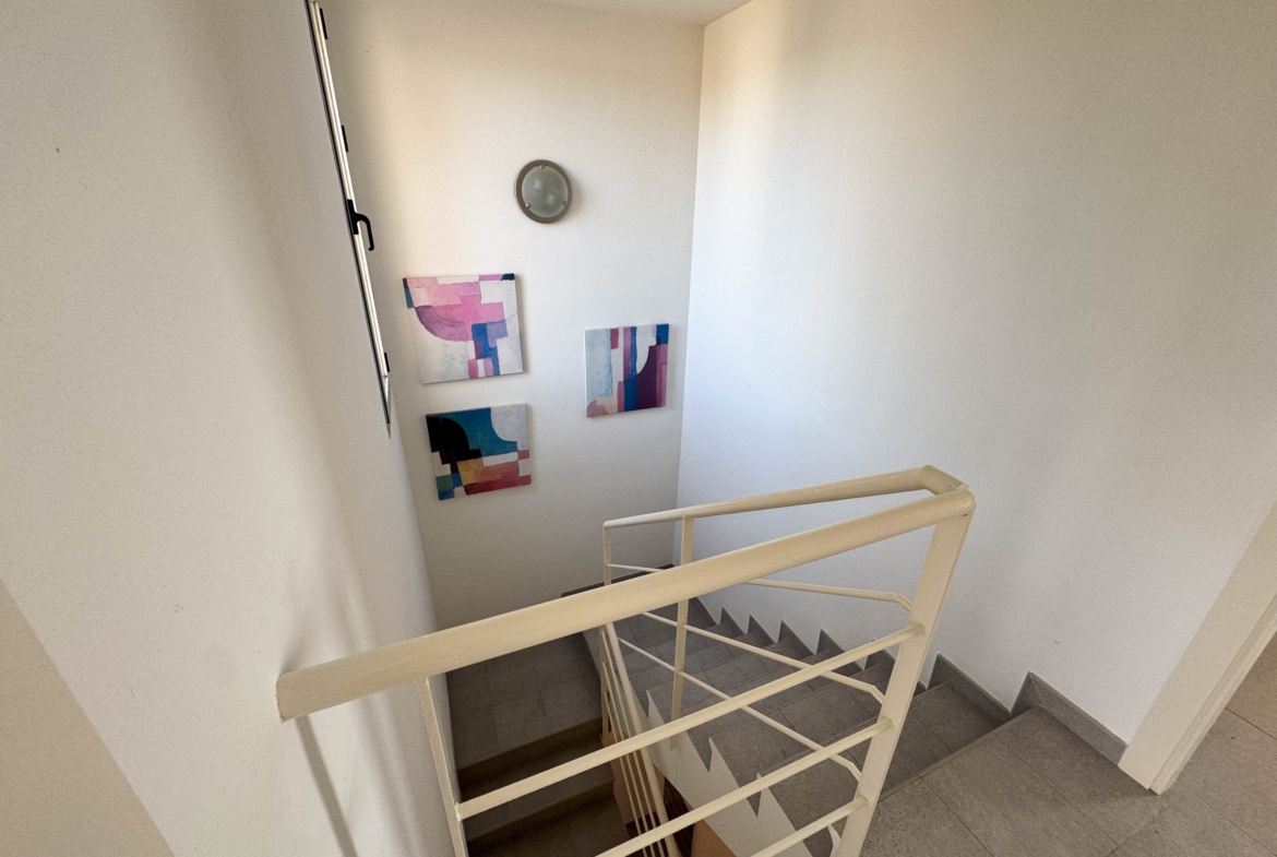 Entering on the ground floor is the main living area, with modern kitchen, opening onto a large terrace. There is also a bedroom, bathroom and office/study